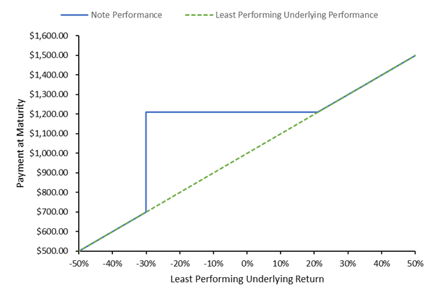 ●If the closing level of the Least Performing Index decreases 5.00%, investors will receive at maturity a return equal to 21.10%, or $1,211.00 per $1,000 principal amount note.