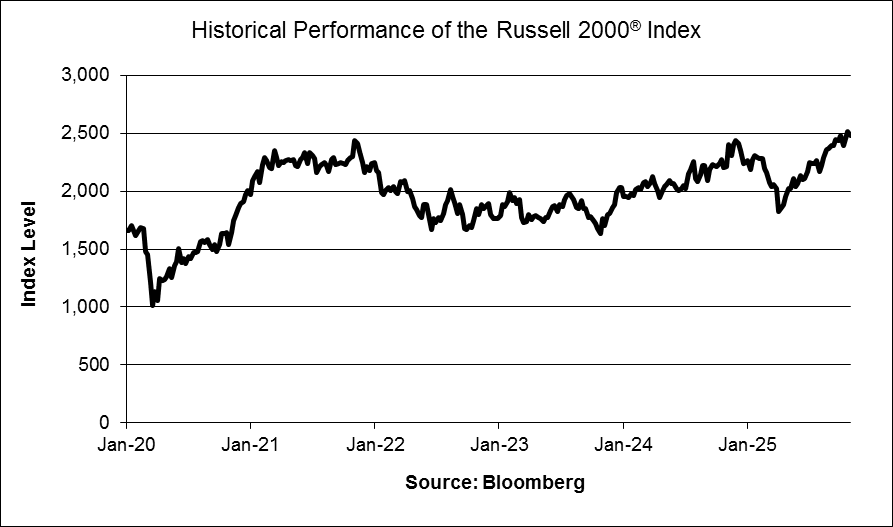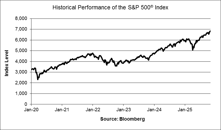The following graphs set forth the historical performance of each Index based on the weekly historical closing levels from January 3, 2020 through December 19, 2025. The closing level of the S&P 500® Index on December 19, 2025 was 6,834.50. The closing level of the Russell 2000® Index on December 19, 2025 was 2,529.425. The closing level of the Dow Jones Industrial Average® on December 19, 2025 was 48,134.89. We obtained the closing levels above and below from the Bloomberg Professional® service (“Bloomberg”), without independent verification.
