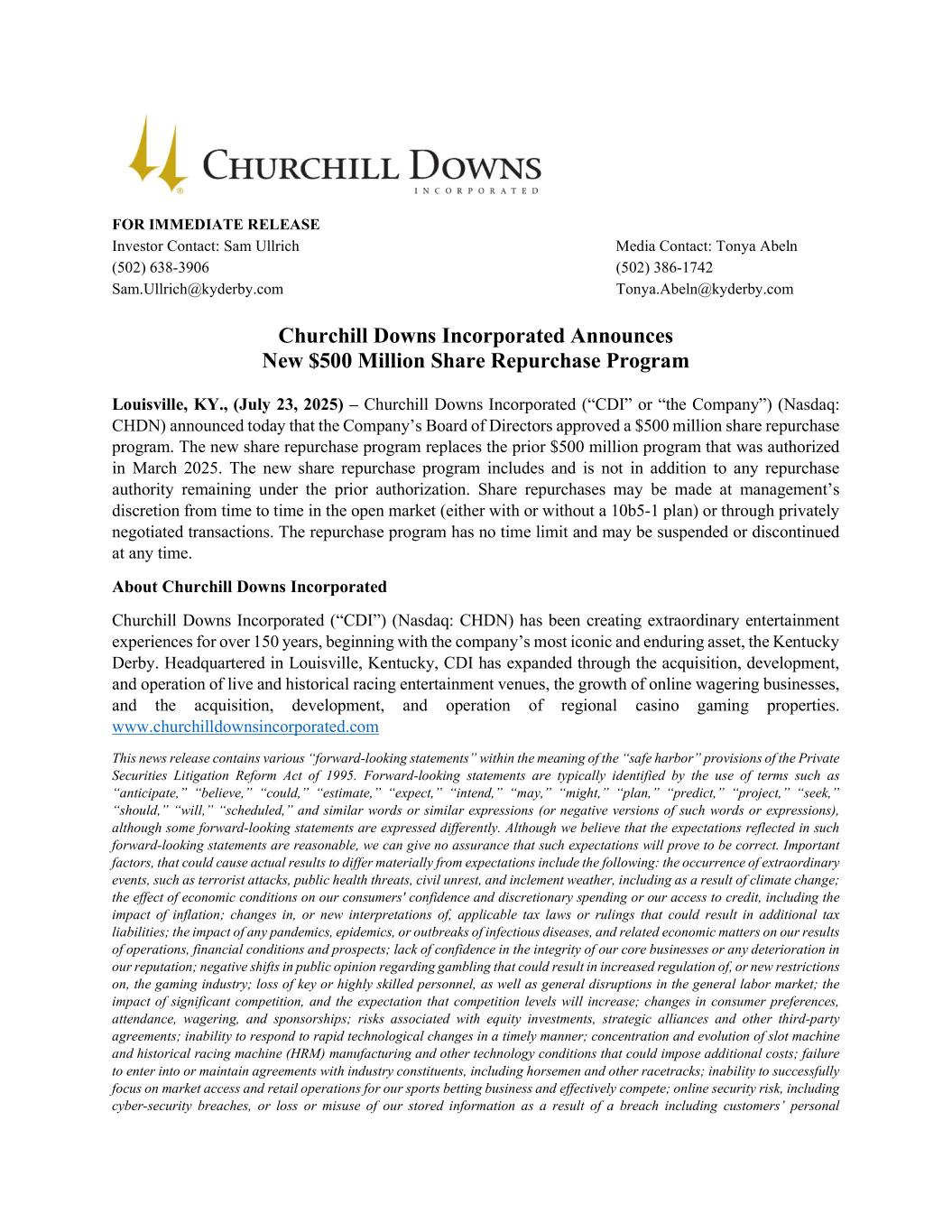 FOR IMMEDIATE RELEASE Investor Contact: Sam Ullrich Media Contact: Tonya Abeln (502) 638-3906 (502) 386-1742 Sam.Ullrich@kyderby.com Tonya.Abeln@kyderby.com Churchill Downs Incorporated Announces New $500 Million Share Repurchase Program Louisville, KY., (July 23, 2025) – Churchill Downs Incorporated (“CDI” or “the Company”) (Nasdaq: CHDN) announced today that the Company’s Board of Directors approved a $500 million share repurchase program. The new share repurchase program replaces the prior $500 million program that was authorized in March 2025. The new share repurchase program includes and is not in addition to any repurchase authority remaining under the prior authorization. Share repurchases may be made at management’s discretion from time to time in the open market (either with or without a 10b5-1 plan) or through privately negotiated transactions. The repurchase program has no time limit and may be suspended or discontinued at any time. About Churchill Downs Incorporated Churchill Downs Incorporated (“CDI”) (Nasdaq: CHDN) has been creating extraordinary entertainment experiences for over 150 years, beginning with the company’s most iconic and enduring asset, the Kentucky Derby. Headquartered in Louisville, Kentucky, CDI has expanded through the acquisition, development, and operation of live and historical racing entertainment venues, the growth of online wagering businesses, and the acquisition, development, and operation of regional casino gaming properties. www.churchilldownsincorporated.com This news release contains various “forward-looking statements” within the meaning of the “safe harbor” provisions of the Private Securities Litigation Reform Act of 1995. Forward-looking statements are typically identified by the use of terms such as “anticipate,” “believe,” “could,” “estimate,” “expect,” “intend,” “may,” “might,” “plan,” “predict,” “project,” “seek,” “should,” “will,” “scheduled,” and similar words or similar expressions (or negative versions of such words or expressions), although some forward-looking statements are expressed differently. Although we believe that the expectations reflected in such forward-looking statements are reasonable, we can give no assurance that such expectations will prove to be correct. Important factors, that could cause actual results to differ materially from expectations include the following: the occurrence of extraordinary events, such as terrorist attacks, public health threats, civil unrest, and inclement weather, including as a result of climate change; the effect of economic conditions on our consumers' confidence and discretionary spending or our access to credit, including the impact of inflation; changes in, or new interpretations of, applicable tax laws or rulings that could result in additional tax liabilities; the impact of any pandemics, epidemics, or outbreaks of infectious diseases, and related economic matters on our results of operations, financial conditions and prospects; lack of confidence in the integrity of our core businesses or any deterioration in our reputation; negative shifts in public opinion regarding gambling that could result in increased regulation of, or new restrictions on, the gaming industry; loss of key or highly skilled personnel, as well as general disruptions in the general labor market; the impact of significant competition, and the expectation that competition levels will increase; changes in consumer preferences, attendance, wagering, and sponsorships; risks associated with equity investments, strategic alliances and other third-party agreements; inability to respond to rapid technological changes in a timely manner; concentration and evolution of slot machine and historical racing machine (HRM) manufacturing and other technology conditions that could impose additional costs; failure to enter into or maintain agreements with industry constituents, including horsemen and other racetracks; inability to successfully focus on market access and retail operations for our sports betting business and effectively compete; online security risk, including cyber-security breaches, or loss or misuse of our stored information as a result of a breach including customers’ personal