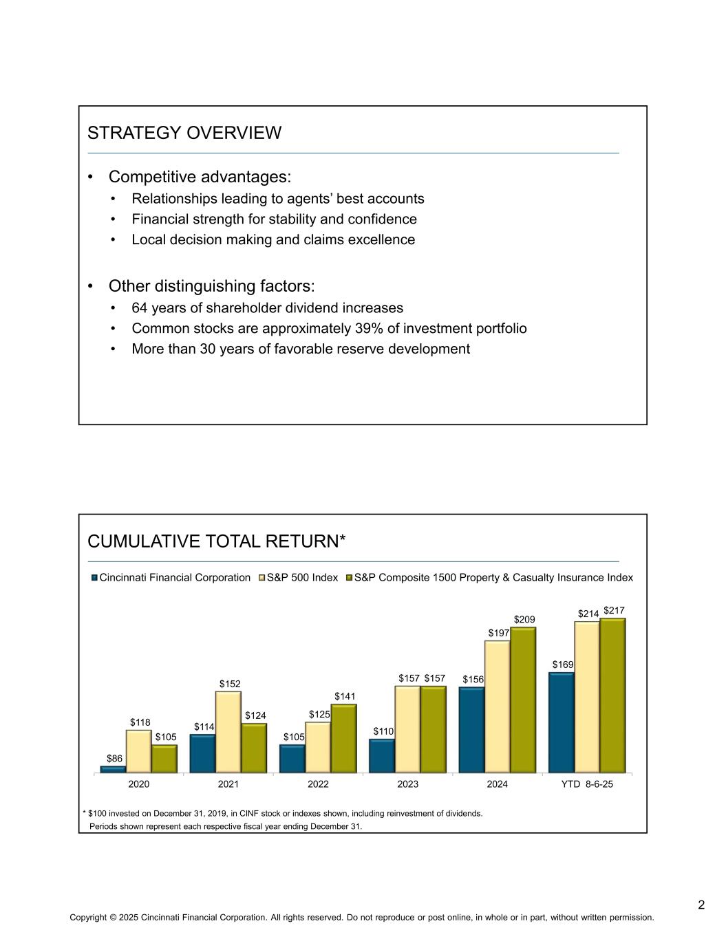 1 Copyright © 2025 Cincinnati Financial Corporation. All rights reserved. Do not reproduce or post online, in whole or in part, without written permission. INVESTOR HANDOUT A Bridge to Better Since 1950 August 2025 NASDAQ: CINF This presentation contains forward-looking statements that involve risks and uncertainties. Please refer to our various filings with the U.S. Securities and Exchange Commission for factors that could cause results to materially differ from those discussed. The forward-looking information in this presentation has been publicly disclosed, most recently on July 28, 2025, and should be considered to be effective only as of that date. Its inclusion in this document is not intended to be an update or reaffirmation of the forward-looking information as of any later date. Reconciliations of non-GAAP measures are in our most recent quarterly earnings news release, which is available at investors.cinfin.com.