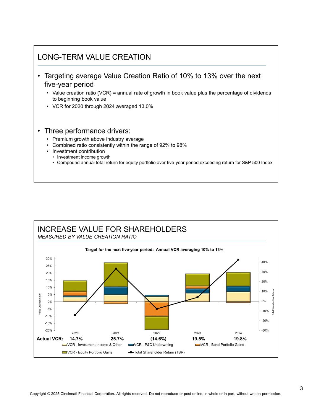 3 Copyright © 2025 Cincinnati Financial Corporation. All rights reserved. Do not reproduce or post online, in whole or in part, without written permission. LONG-TERM VALUE CREATION • Targeting average Value Creation Ratio of 10% to 13% over the next five-year period • Value creation ratio (VCR) = annual rate of growth in book value plus the percentage of dividends to beginning book value • VCR for 2020 through 2024 averaged 13.0% • Three performance drivers: • Premium growth above industry average • Combined ratio consistently within the range of 92% to 98% • Investment contribution • Investment income growth • Compound annual total return for equity portfolio over five-year period exceeding return for S&P 500 Index INCREASE VALUE FOR SHAREHOLDERS MEASURED BY VALUE CREATION RATIO -30% -20% -10% 0% 10% 20% 30% 40% -20% -15% -10% -5% 0% 5% 10% 15% 20% 25% 30% 2020 2021 2022 2023 2024 VCR - Investment Income & Other VCR - P&C Underwriting VCR - Bond Portfolio Gains VCR - Equity Portfolio Gains Total Shareholder Return (TSR) Actual VCR: 14.7% 25.7% (14.6%) 19.5% 19.8% Target for the next five-year period: Annual VCR averaging 10% to 13% Va lu e Cr ea tio n Ra tio To ta l S ha re ho ld er R et ur n