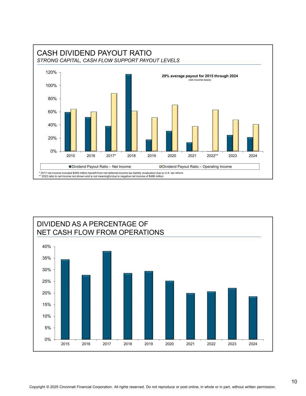 9 Copyright © 2025 Cincinnati Financial Corporation. All rights reserved. Do not reproduce or post online, in whole or in part, without written permission. INCOME AND SHAREHOLDER DIVIDENDS -$4.00 -$2.00 $0.00 $2.00 $4.00 $6.00 $8.00 $10.00 $12.00 $14.00 $16.00 $18.00 2020 2021 2022 2023 2024 6 mos 24 6 mos 25 Non-GAAP Operating Income Net Income Ordinary dividends declared Per share basis 2021 net income included $11.69 net investment gain while 2022 included $7.30 net investment loss STRONG OPERATING CASH FLOW CONTRIBUTED TO $572M OF YTD 6-30-25 NET PURCHASES IN INVESTMENT PORTFOLIO $0 $500 $1,000 $1,500 $2,000 $2,500 2020 2021 2022 2023 2024 6 mos 24 6 mos 25 (In millions)