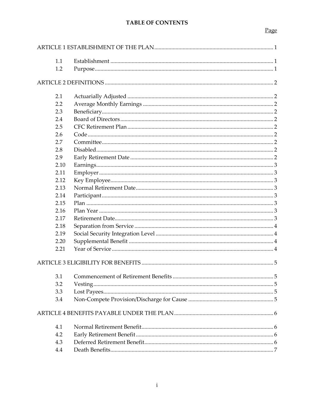 TABLE OF CONTENTS Page i ARTICLE 1 ESTABLISHMENT OF THE PLAN .................................................................................... 1 1.1 Establishment ................................................................................................................... 1 1.2 Purpose .............................................................................................................................. 1 ARTICLE 2 DEFINITIONS ....................................................................................................................... 2 2.1 Actuarially Adjusted ....................................................................................................... 2 2.2 Average Monthly Earnings ............................................................................................ 2 2.3 Beneficiary ......................................................................................................................... 2 2.4 Board of Directors ............................................................................................................ 2 2.5 CFC Retirement Plan ....................................................................................................... 2 2.6 Code ................................................................................................................................... 2 2.7 Committee ......................................................................................................................... 2 2.8 Disabled ............................................................................................................................. 2 2.9 Early Retirement Date ..................................................................................................... 2 2.10 Earnings ............................................................................................................................. 3 2.11 Employer ........................................................................................................................... 3 2.12 Key Employee ................................................................................................................... 3 2.13 Normal Retirement Date ................................................................................................. 3 2.14 Participant ......................................................................................................................... 3 2.15 Plan .................................................................................................................................... 3 2.16 Plan Year ........................................................................................................................... 3 2.17 Retirement Date................................................................................................................ 3 2.18 Separation from Service .................................................................................................. 4 2.19 Social Security Integration Level ................................................................................... 4 2.20 Supplemental Benefit ...................................................................................................... 4 2.21 Year of Service .................................................................................................................. 4 ARTICLE 3 ELIGIBILITY FOR BENEFITS ............................................................................................. 5 3.1 Commencement of Retirement Benefits ....................................................................... 5 3.2 Vesting ............................................................................................................................... 5 3.3 Lost Payees ........................................................................................................................ 5 3.4 Non-Compete Provision/Discharge for Cause ............................................................ 5 ARTICLE 4 BENEFITS PAYABLE UNDER THE PLAN ...................................................................... 6 4.1 Normal Retirement Benefit ............................................................................................. 6 4.2 Early Retirement Benefit ................................................................................................. 6 4.3 Deferred Retirement Benefit ........................................................................................... 6 4.4 Death Benefits ................................................................................................................... 7