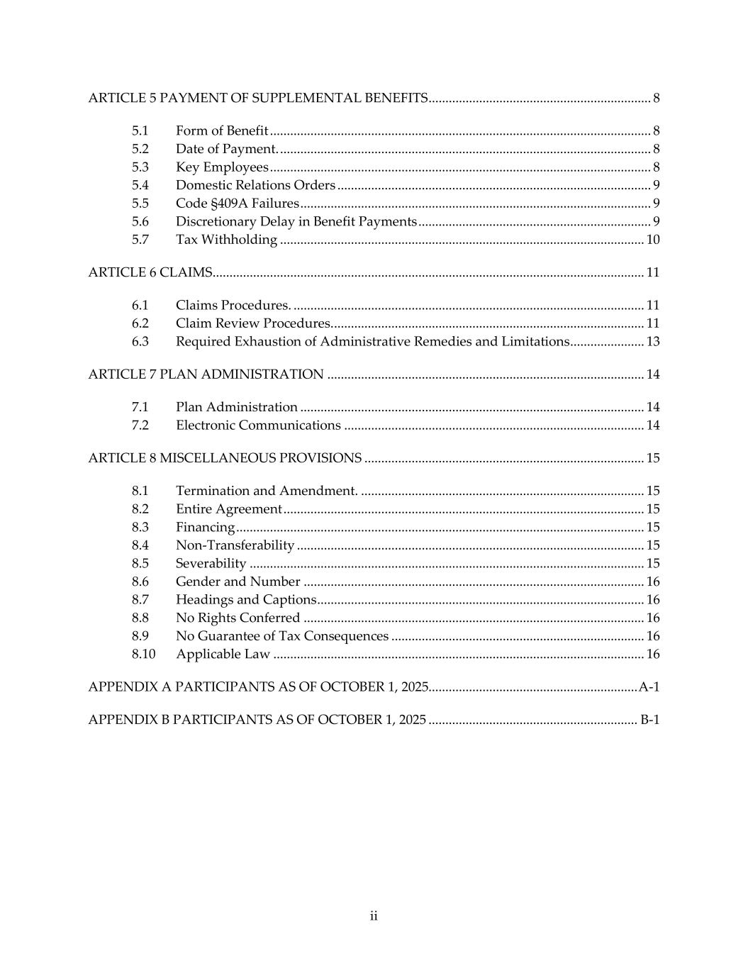 ii ARTICLE 5 PAYMENT OF SUPPLEMENTAL BENEFITS .................................................................. 8 5.1 Form of Benefit ................................................................................................................. 8 5.2 Date of Payment. .............................................................................................................. 8 5.3 Key Employees ................................................................................................................. 8 5.4 Domestic Relations Orders ............................................................................................. 9 5.5 Code §409A Failures ........................................................................................................ 9 5.6 Discretionary Delay in Benefit Payments ..................................................................... 9 5.7 Tax Withholding ............................................................................................................ 10 ARTICLE 6 CLAIMS ................................................................................................................................ 11 6.1 Claims Procedures. ........................................................................................................ 11 6.2 Claim Review Procedures. ............................................................................................ 11 6.3 Required Exhaustion of Administrative Remedies and Limitations ...................... 13 ARTICLE 7 PLAN ADMINISTRATION .............................................................................................. 14 7.1 Plan Administration ...................................................................................................... 14 7.2 Electronic Communications ......................................................................................... 14 ARTICLE 8 MISCELLANEOUS PROVISIONS ................................................................................... 15 8.1 Termination and Amendment. .................................................................................... 15 8.2 Entire Agreement ........................................................................................................... 15 8.3 Financing ......................................................................................................................... 15 8.4 Non-Transferability ....................................................................................................... 15 8.5 Severability ..................................................................................................................... 15 8.6 Gender and Number ..................................................................................................... 16 8.7 Headings and Captions ................................................................................................. 16 8.8 No Rights Conferred ..................................................................................................... 16 8.9 No Guarantee of Tax Consequences ........................................................................... 16 8.10 Applicable Law .............................................................................................................. 16 APPENDIX A PARTICIPANTS AS OF OCTOBER 1, 2025.............................................................. A-1 APPENDIX B PARTICIPANTS AS OF OCTOBER 1, 2025 .............................................................. B-1