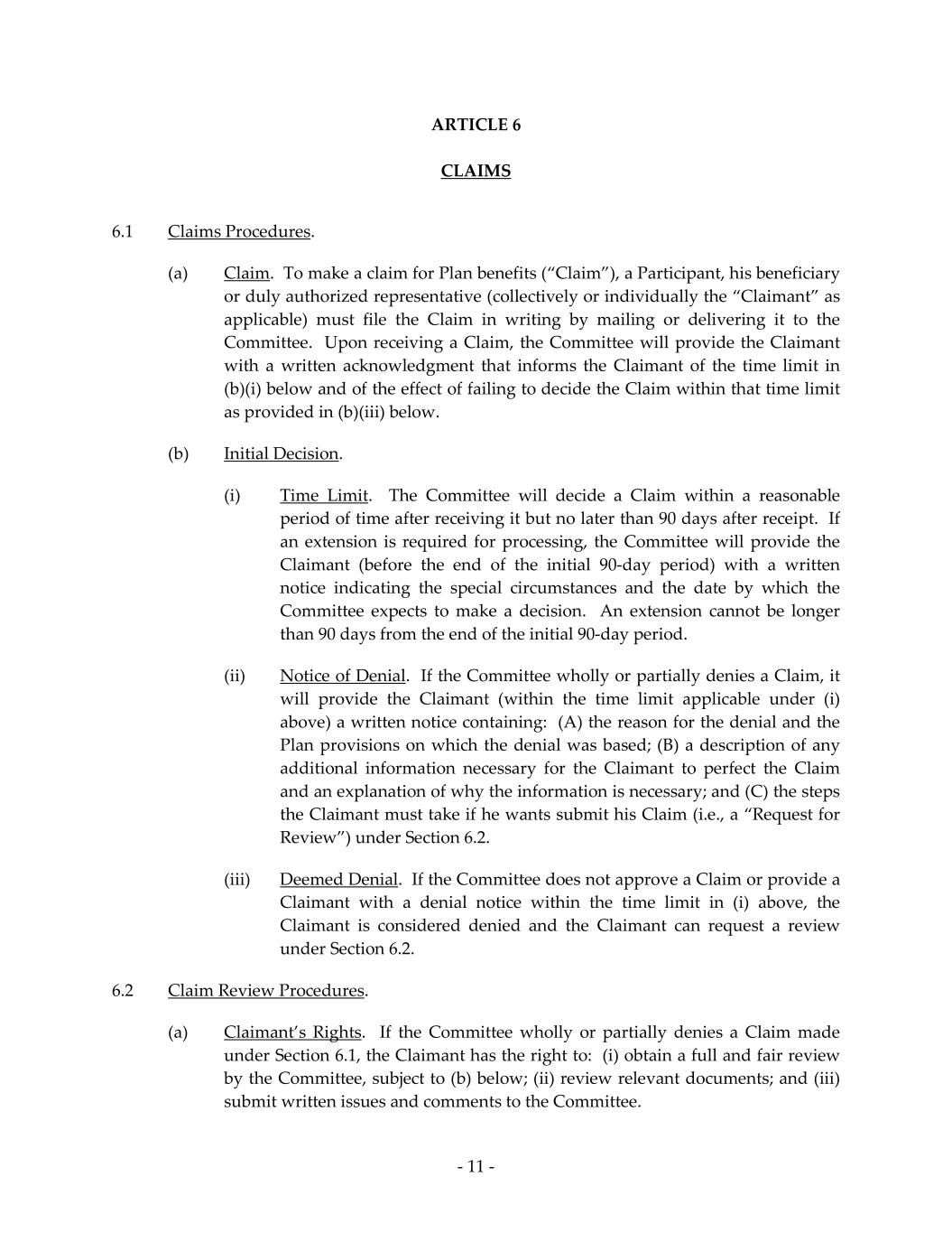 - 11 - ARTICLE 6 CLAIMS 6.1 Claims Procedures. (a) Claim. To make a claim for Plan benefits (“Claim”), a Participant, his beneficiary or duly authorized representative (collectively or individually the “Claimant” as applicable) must file the Claim in writing by mailing or delivering it to the Committee. Upon receiving a Claim, the Committee will provide the Claimant with a written acknowledgment that informs the Claimant of the time limit in (b)(i) below and of the effect of failing to decide the Claim within that time limit as provided in (b)(iii) below. (b) Initial Decision. (i) Time Limit. The Committee will decide a Claim within a reasonable period of time after receiving it but no later than 90 days after receipt. If an extension is required for processing, the Committee will provide the Claimant (before the end of the initial 90-day period) with a written notice indicating the special circumstances and the date by which the Committee expects to make a decision. An extension cannot be longer than 90 days from the end of the initial 90-day period. (ii) Notice of Denial. If the Committee wholly or partially denies a Claim, it will provide the Claimant (within the time limit applicable under (i) above) a written notice containing: (A) the reason for the denial and the Plan provisions on which the denial was based; (B) a description of any additional information necessary for the Claimant to perfect the Claim and an explanation of why the information is necessary; and (C) the steps the Claimant must take if he wants submit his Claim (i.e., a “Request for Review”) under Section 6.2. (iii) Deemed Denial. If the Committee does not approve a Claim or provide a Claimant with a denial notice within the time limit in (i) above, the Claimant is considered denied and the Claimant can request a review under Section 6.2. 6.2 Claim Review Procedures. (a) Claimant’s Rights. If the Committee wholly or partially denies a Claim made under Section 6.1, the Claimant has the right to: (i) obtain a full and fair review by the Committee, subject to (b) below; (ii) review relevant documents; and (iii) submit written issues and comments to the Committee.