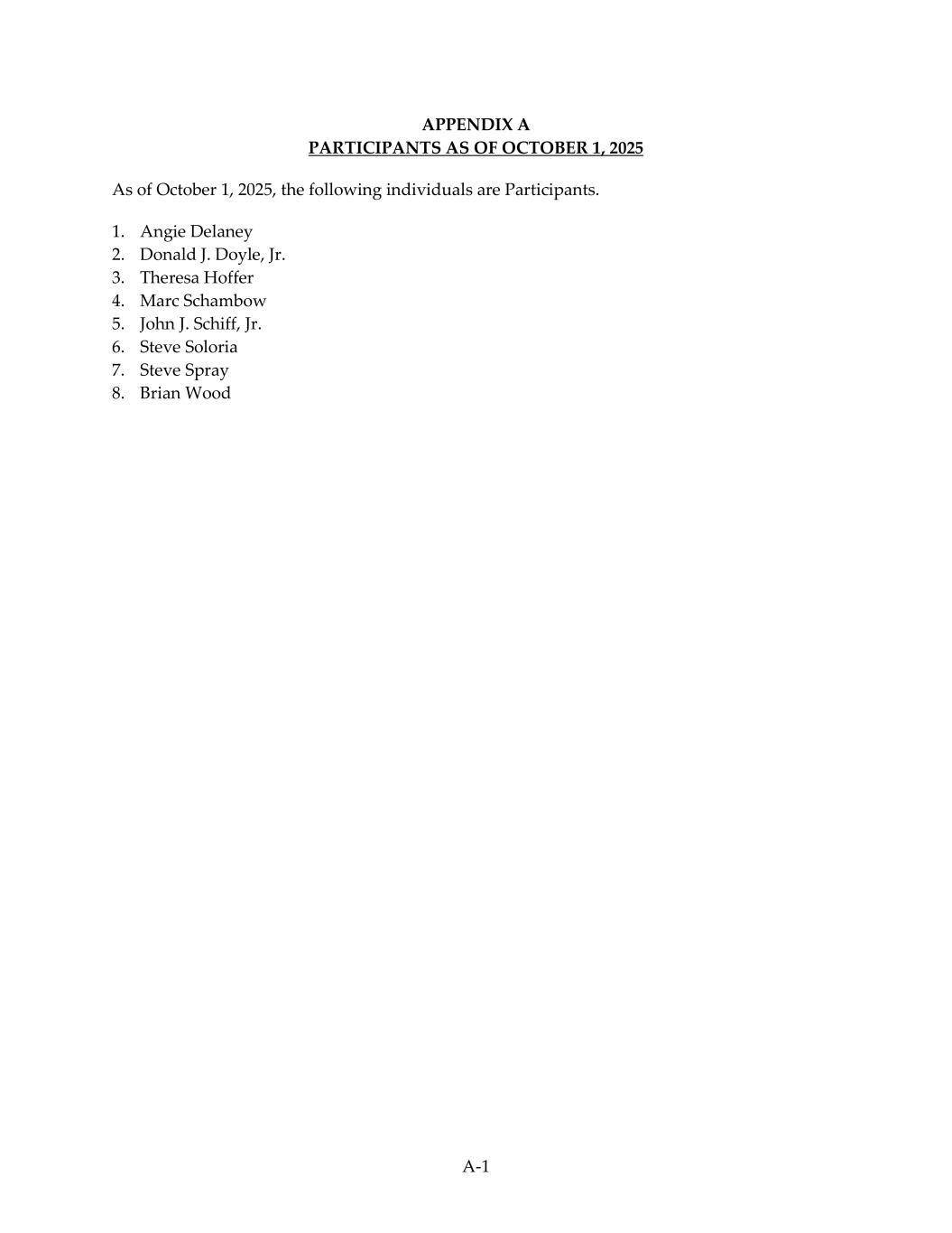 A-1 APPENDIX A PARTICIPANTS AS OF OCTOBER 1, 2025 As of October 1, 2025, the following individuals are Participants. 1. Angie Delaney 2. Donald J. Doyle, Jr. 3. Theresa Hoffer 4. Marc Schambow 5. John J. Schiff, Jr. 6. Steve Soloria 7. Steve Spray 8. Brian Wood