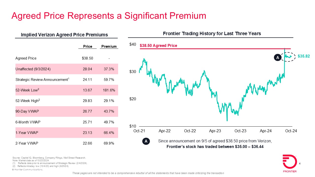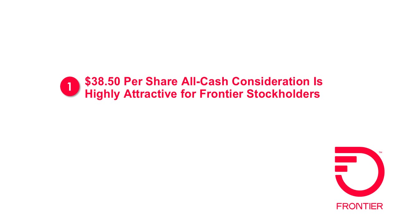 Verizon’s best and final all-cash offer of $38.50 per share is highly attractive and creates significant value for stockholders, reflecting a 37% premium to Frontier’s pre-announcement price and a