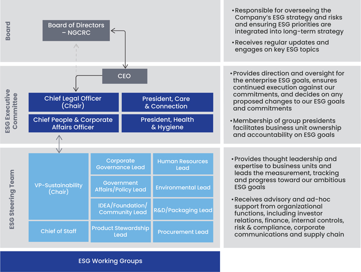 The Board is highly engaged in overseeing Clorox’s business and the key risks the Company faces. Clorox’s ESG goals are embedded in how we operate and our efforts are focused on the areas of greatest impact to the Company. As part of our commitment to lead with transparency and accountability, we continued to evolve our approach to ESG governance this past year, including reorganizing our ESG operating and governance structure and hiring our first full-time head of sustainability to lead ESG work. This new structure, along with related processes, will further integrate our IGNITE ESG goals into business units, streamline decision-making authority, allocate resources, and drive continued accountability.