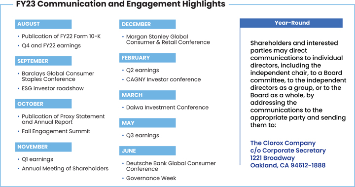 Our Board is also focused on its engagement with the workforce, including meeting with employees at a Clorox Home Care plant in fiscal year 2023, receiving regular company highlights covering employee resource group activities, community events, company-wide communications, and employee features, as well as spending additional time at the Company’s facilities.