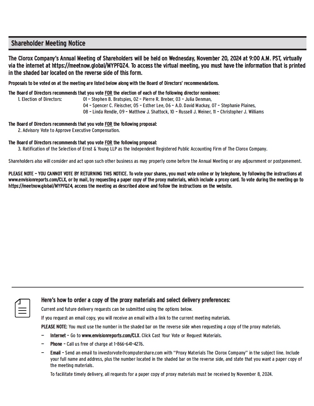 Here’s how to order a copy of the proxy materials and select delivery preferences: Current and future delivery requests can be submitted using the options below. If you request an email copy, you will receive an email with a link to the current meeting materials. PLEASE NOTE: You must use the number in the shaded bar on the reverse side when requesting a copy of the proxy materials. — Internet – Go to www.envisionreports.com/CLX. Click Cast Your Vote or Request Materials. — Phone – Call us free of charge at 1-866-641-4276. — Email – Send an email to investorvote@computershare.com with “Proxy Materials The Clorox Company” in the subject line. Include your full name and address, plus the number located in the shaded bar on the reverse side, and state that you want a paper copy of the meeting materials. To facilitate timely delivery, all requests for a paper copy of proxy materials must be received by November 8, 2024. The Clorox Company’s Annual Meeting of Shareholders will be held on Wednesday, November 20, 2024 at 9:00 A.M. PST, virtually via the internet at https://meetnow.global/MYPFQZ4. To access the virtual meeting, you must have the information that is printed in the shaded bar located on the reverse side of this form. Proposals to be voted on at the meeting are listed below along with the Board of Directors’ recommendations. The Board of Directors recommends that you vote FOR the election of each of the following director nominees: 1. Election of Directors: 01 – Stephen B. Bratspies, 02 – Pierre R. Breber, 03 – Julia Denman, 04 – Spencer C. Fleischer, 05 – Esther Lee, 06 – A.D. David Mackay, 07 – Stephanie Plaines, 08 – Linda Rendle, 09 – Matthew J. Shattock, 10 – Russell J. Weiner, 11 – Christopher J. Williams The Board of Directors recommends that you vote FOR the following proposal: 2. Advisory Vote to Approve Executive Compensation. The Board of Directors recommends that you vote FOR the following proposal: 3. Ratification of the Selection of Ernst & Young LLP as the Independent Registered Public Accounting Firm of The Clorox Company. Shareholders also will consider and act upon such other business as may properly come before the Annual Meeting or any adjournment or postponement. PLEASE NOTE – YOU CANNOT VOTE BY RETURNING THIS NOTICE. To vote your shares, you must vote online or by telephone, by following the instructions at www.envisionreports.com/CLX, or by mail, by requesting a paper copy of the proxy materials, which include a proxy card. To vote during the meeting go to https://meetnow.global/MYPFQZ4, access the meeting as described above and follow the instructions on the website. Shareholder Meeting Notice