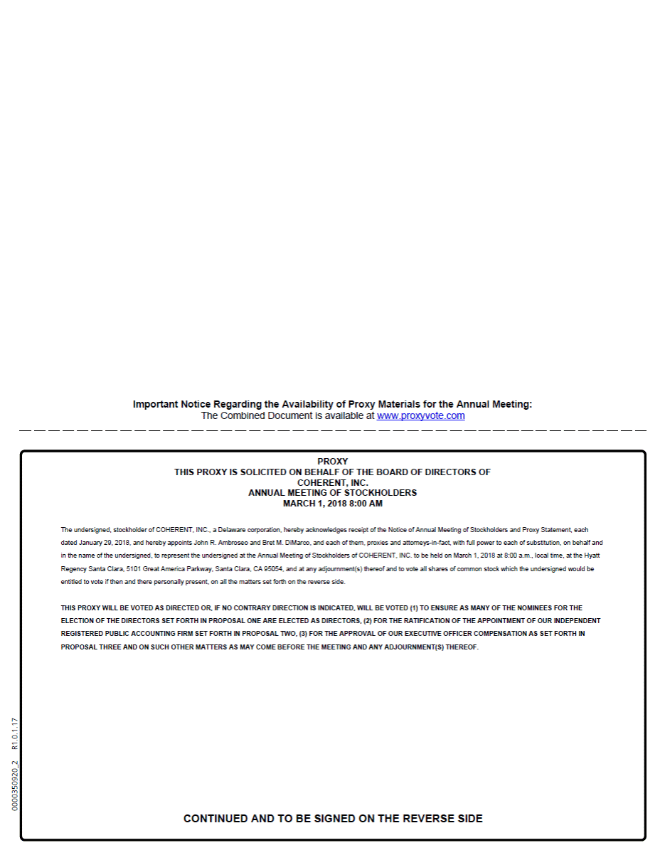Important Notice Regarding the Availability of Proxy Materials for the Annual Meeting: The Combined Document is available at www.proxyvote.com PROXY THIS PROXY IS SOLICITED ON BEHALF OF THE BOARD OF DIRECTORS OF COHERENT, INC. ANNUAL MEETING OF STOCKHOLDERS MARCH 1, 2018 8:00 AM The undersigned, stockholder of COHERENT, INC., a Delaware corporation, hereby acknowledges receipt of the Notice of Annual Meeting of Stockholders and Proxy Statement, each dated January 29, 2018, and hereby appoints John R. Ambroseo and Bret M. DiMarco, and each of them, proxies and attorneys-in-fact, with full power to each of substitution, on behalf and in the name of the undersigned, to represent the undersigned at the Annual Meeting of Stockholders of COHERENT, INC. to be held on March 1, 2018 at 8:00 a.m., local time, at the Hyatt Regency Santa Clara, 5101 Great America Parkway, Santa Clara, CA 95054, and at any adjournment(s) thereof and to vote all shares of common stock which the undersigned would be entitled to vote if then and there personally present, on all the matters set forth on the reverse side. THIS PROXY WILL BE VOTED AS DIRECTED OR, IF NO CONTRARY DIRECTION IS INDICATED, WILL BE VOTED (1) TO ENSURE AS MANY OF THE NOMINEES FOR THE ELECTION OF THE DIRECTORS SET FORTH IN PROPOSAL ONE ARE ELECTED AS DIRECTORS, (2) FOR THE RATIFICATION OF THE APPOINTMENT OF OUR INDEPENDENT REGISTERED PUBLIC ACCOUNTING FIRM SET FORTH IN PROPOSAL TWO, (3) FOR THE APPROVAL OF OUR EXECUTIVE OFFICER COMPENSATION AS SET FORTH IN PROPOSAL THREE AND ON SUCH OTHER MATTERS AS MAY COME BEFORE THE MEETING AND ANY ADJOURNMENT(S) THEREOF. CONTINUED AND TO BE SIGNED ON THE REVERSE SIDE 0000350920_2 R1.0.1.17