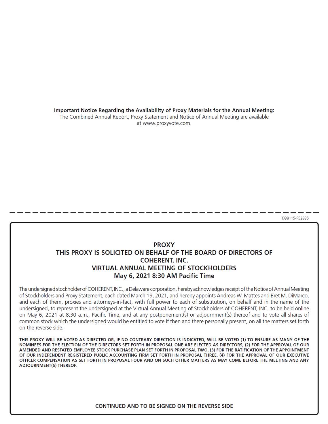 Important Notice Regarding the Availability of Proxy Materials for the Annual Meeting: The Combined Annual Report, Proxy Statement and Notice of Annual Meeting are available at www.proxyvote.com. D38115-P52835 PROXY THIS PROXY IS SOLICITED ON BEHALF OF THE BOARD OF DIRECTORS OF COHERENT, INC. VIRTUAL ANNUAL MEETING OF STOCKHOLDERS May 6, 2021 8:30 AM Pacific Time The undersigned stockholder of COHERENT, INC., a Delaware corporation, hereby acknowledges receipt of the Notice of Annual Meeting of Stockholders and Proxy Statement, each dated March 19, 2021, and hereby appoints Andreas W. Mattes and Bret M. DiMarco, and each of them, proxies and attorneys-in-fact, with full power to each of substitution, on behalf and in the name of the undersigned, to represent the undersigned at the Virtual Annual Meeting of Stockholders of COHERENT, INC. to be held online on May 6, 2021 at 8:30 a.m., Pacific Time, and at any postponement(s) or adjournment(s) thereof and to vote all shares of common stock which the undersigned would be entitled to vote if then and there personally present, on all the matters set forth on the reverse side. THIS PROXY WILL BE VOTED AS DIRECTED OR, IF NO CONTRARY DIRECTION IS INDICATED, WILL BE VOTED (1) TO ENSURE AS MANY OF THE NOMINEES FOR THE ELECTION OF THE DIRECTORS SET FORTH IN PROPOSAL ONE ARE ELECTED AS DIRECTORS, (2) FOR THE APPROVAL OF OUR AMENDED AND RESTATED EMPLOYEE STOCK PURCHASE PLAN SET FORTH IN PROPOSAL TWO, (3) FOR THE RATIFICATION OF THE APPOINTMENT OF OUR INDEPENDENT REGISTERED PUBLIC ACCOUNTING FIRM SET FORTH IN PROPOSAL THREE, (4) FOR THE APPROVAL OF OUR EXECUTIVE OFFICER COMPENSATION AS SET FORTH IN PROPOSAL FOUR AND ON SUCH OTHER MATTERS AS MAY COME BEFORE THE MEETING AND ANY ADJOURNMENT(S) THEREOF. CONTINUED AND TO BE SIGNED ON THE REVERSE SIDE