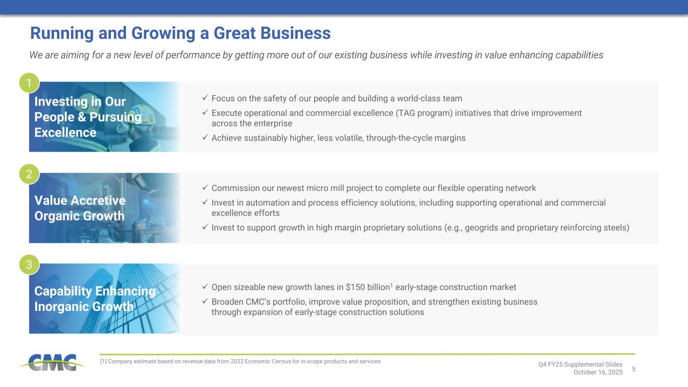 3 © GeoNames, Microsoft, TomTom Powered by Bing A Market Leader with a Winning Formula CMC is charting the course for improved profitability. Starting from a position of competitive strength, we see structural tailwinds in our core North American construction markets for years to come and meaningful opportunities for margin growth. Strong Competitive Position Solid Momentum Supported by Exposure to Attractive End Markets Game Changing Strategy to Create Value Leading domestic market positions in major solutions1 Density in high-growth Sunbelt region Excellent balance sheet and financial flexibility #1 • Rebar • Fabricated Rebar • Geogrid • Anchor cages • Fence posts • Aggregate Piers Re ba r D em an d pe r C ap ita 4 Powerful, long-term structural demand trends Strong public infrastructure spending; 60%2 of the Infrastructure Investment and Jobs Act (“IIJA”) remaining to be spent Robust pipeline of construction projects with pent-up demand building Margins expanding $150 billion3 early-stage construction market to accommodate future growth aspirations • Infrastructure investment • Re-shoring of manufacturing • Energy generation and transmission • Addressing U.S. housing shortage • AI infrastructure • Positive demographics in Sunbelt Focus on value generation for shareholders regardless of market environment Targeting permanent enhancements to financial profile, including: Higher, more stable margins and earnings Cash flows with reduced capital intensity Higher ROICs Q4 FY25 Supplemental Slides October 16, 2025 Demonstrated capability with our Transform, Advance, Grow ("TAG") program, with more to come High return organic growth projects in pipeline Evaluating and pursuing opportunities for inorganic growth to complement product offering and increase value add Robust capital returns to shareholders [1] Based on company estimates [2] IIJA funding status as of July 31, 2025 per U.S. Department of Transportation [3] Company estimate based on revenue data from 2022 Economic Census for in-scope products and services [4] Based on data from the Concrete Reinforcing Steel Institute and the U.S. Census Bureau