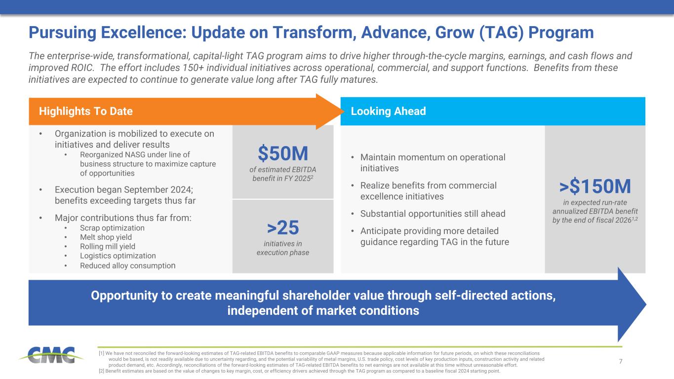 6 Strong Strategic Execution in FY 2025 Lays the Groundwork for Future Years Q4 FY25 Supplemental Slides October 16, 2025 The actions taken in FY 2025 will have a meaningful impact on future financial performance. The foundation is set for growth ahead. Investing in Our People & Pursuing Excellence 1 Value Accretive Organic Growth 2 Capability Enhancing Inorganic Growth 3 [1] Company estimate based on revenue data from 2022 Economic Census for in-scope products and services Third consecutive year of record safety performance – reduced frequency and severity of incidents Leadership and resources in place to support strategic execution and growth across the organization TAG program achieved benefits above first year targets Streamlined reporting structures to facilitate long-term success of TAG • Continue to improve world-class safety performance and drive to a goal of zero incidents • Launch additional TAG initiatives and maintain strong year 1 momentum • Generate meaningful benefits from TAG commercial excellence efforts Obtained 48C tax credit for Steel West Virginia; expected net cash benefit of $80 million Achieved EBITDA positive results from Arizona 2 micro mill during the fourth quarter Construction of attractive projects to expand production of GalvaBar and Tensar geogrid • Begin commissioning efforts at Steel West Virginia during 2026 • Maintain recent operational momentum at Arizona 2 • Continue development of new EBG product lines to support enhanced market penetration Developed strategic roadmap for expansion in $150 billion1 early-stage construction market Announced pending acquisition of Concrete Pipe & Precast (CP&P) on September 18th with an expected transaction close by the end of CY 2025 Announced pending acquisition of Foley Products Company (Foley) with an expected transaction close by the end of CY 2025 • Successfully integrate CP&P and Foley and execute on identified growth and synergy opportunities • Pursue attractive opportunities to increase scale of new precast concrete platform Recent Achievements What’s Next