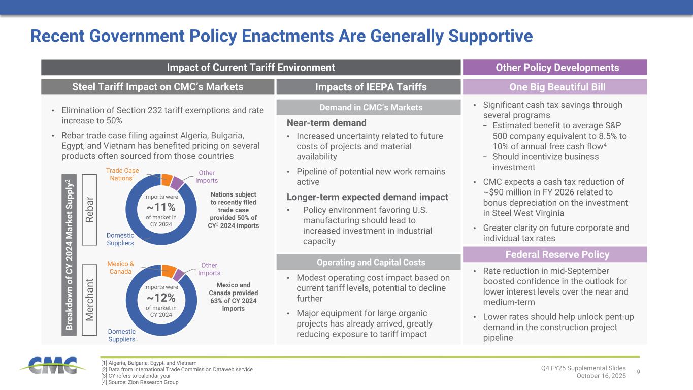 9 • Rate reduction in mid-September boosted confidence in the outlook for lower interest levels over the near and medium-term • Lower rates should help unlock pent-up demand in the construction project pipeline • Significant cash tax savings through several programs − Estimated benefit to average S&P 500 company equivalent to 8.5% to 10% of annual free cash flow4 − Should incentivize business investment • CMC expects a cash tax reduction of ~$90 million in FY 2026 related to bonus depreciation on the investment in Steel West Virginia • Greater clarity on future corporate and individual tax rates • Modest operating cost impact based on current tariff levels, potential to decline further • Major equipment for large organic projects has already arrived, greatly reducing exposure to tariff impact Near-term demand • Increased uncertainty related to future costs of projects and material availability • Pipeline of potential new work remains active Longer-term expected demand impact • Policy environment favoring U.S. manufacturing should lead to increased investment in industrial capacity Demand in CMC’s Markets• Elimination of Section 232 tariff exemptions and rate increase to 50% • Rebar trade case filing against Algeria, Bulgaria, Egypt, and Vietnam has benefited pricing on several products often sourced from those countries Mexico & Canada Other Imports Domestic Suppliers Trade Case Nations1 Other Imports Domestic Suppliers Recent Government Policy Enactments Are Generally Supportive Steel Tariff Impact on CMC’s Markets Impacts of IEEPA Tariffs Br ea kd ow n of C Y 20 24 M ar ke t S up pl y2 Re ba r M er ch an t Q4 FY25 Supplemental Slides October 16, 2025 Nations subject to recently filed trade case provided 50% of CY3 2024 imports Imports were ~11% of market in CY 2024 Imports were ~12% of market in CY 2024 Mexico and Canada provided 63% of CY 2024 imports [1] Algeria, Bulgaria, Egypt, and Vietnam [2] Data from International Trade Commission Dataweb service [3] CY refers to calendar year [4] Source: Zion Research Group Operating and Capital Costs Impact of Current Tariff Environment Other Policy Developments One Big Beautiful Bill Federal Reserve Policy
