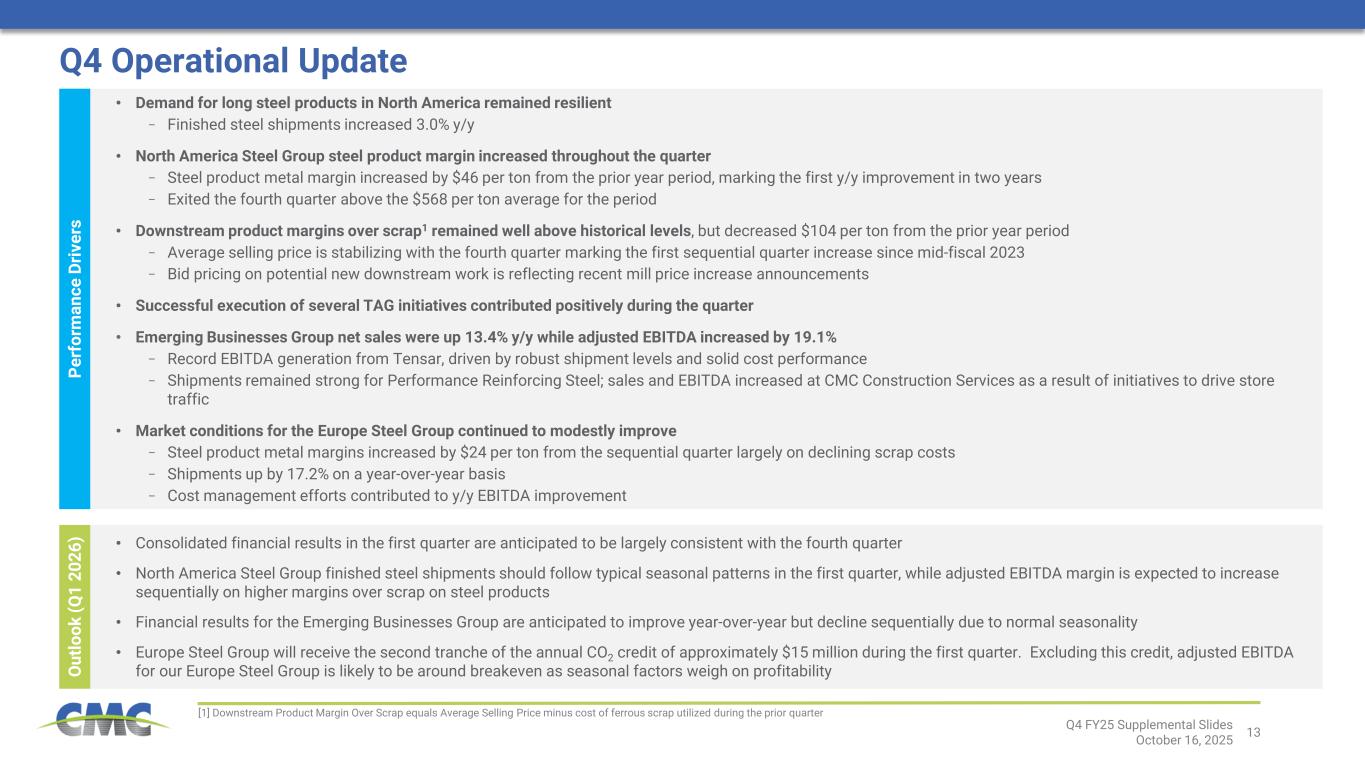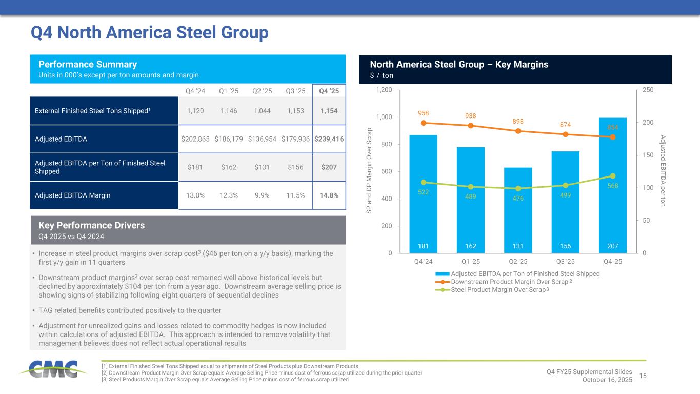 13 • Consolidated financial results in the first quarter are anticipated to be largely consistent with the fourth quarter • North America Steel Group finished steel shipments should follow typical seasonal patterns in the first quarter, while adjusted EBITDA margin is expected to increase sequentially on higher margins over scrap on steel products • Financial results for the Emerging Businesses Group are anticipated to improve year-over-year but decline sequentially due to normal seasonality • Europe Steel Group will receive the second tranche of the annual CO2 credit of approximately $15 million during the first quarter. Excluding this credit, adjusted EBITDA for our Europe Steel Group is likely to be around breakeven as seasonal factors weigh on profitability • Demand for long steel products in North America remained resilient − Finished steel shipments increased 3.0% y/y • North America Steel Group steel product margin increased throughout the quarter − Steel product metal margin increased by $46 per ton from the prior year period, marking the first y/y improvement in two years − Exited the fourth quarter above the $568 per ton average for the period • Downstream product margins over scrap1 remained well above historical levels, but decreased $104 per ton from the prior year period − Average selling price is stabilizing with the fourth quarter marking the first sequential quarter increase since mid-fiscal 2023 − Bid pricing on potential new downstream work is reflecting recent mill price increase announcements • Successful execution of several TAG initiatives contributed positively during the quarter • Emerging Businesses Group net sales were up 13.4% y/y while adjusted EBITDA increased by 19.1% − Record EBITDA generation from Tensar, driven by robust shipment levels and solid cost performance − Shipments remained strong for Performance Reinforcing Steel; sales and EBITDA increased at CMC Construction Services as a result of initiatives to drive store traffic • Market conditions for the Europe Steel Group continued to modestly improve − Steel product metal margins increased by $24 per ton from the sequential quarter largely on declining scrap costs − Shipments up by 17.2% on a year-over-year basis − Cost management efforts contributed to y/y EBITDA improvement Pe rf or m an ce D riv er s O ut lo ok (Q 1 20 26 ) Q4 Operational Update [1] Downstream Product Margin Over Scrap equals Average Selling Price minus cost of ferrous scrap utilized during the prior quarter Q4 FY25 Supplemental Slides October 16, 2025