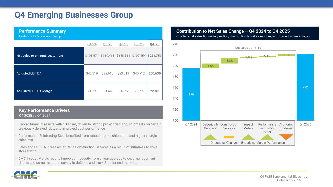 16 196 222 4.6% 5.2% 1.0% 0.9% 1.7% 100 120 140 160 180 200 220 240 Q4 2024 Geogrids & Geopiers Construction Services Impact Metals Performance Reinforcing Steel Anchoring Systems Q4 2025 Key Performance Drivers Q4 2025 vs Q4 2024 Q4 Emerging Businesses Group Q4 ’24 Q1 ’25 Q2 ’25 Q3 ’25 Q4 ’25 Net sales to external customers $195,571 $169,415 $158,864 $197,454 $221,753 Adjusted EBITDA $42,519 $22,660 $23,519 $40,912 $50,630 Adjusted EBITDA Margin 21.7% 13.4% 14.8% 20.7% 22.8% Performance Summary Units in 000’s except margin • Record financial results within Tensar, driven by strong project demand, shipments on certain previously delayed jobs, and improved cost performance • Performance Reinforcing Steel benefited from robust project shipments and higher margin sales mix • Sales and EBITDA increased at CMC Construction Services as a result of initiatives to drive store traffic • CMC Impact Metals results improved modestly from a year ago due to cost management efforts and some modest recovery in defense and truck & trailer end markets. Contribution to Net Sales Change – Q4 2024 to Q4 2025 Quarterly net sales figures in $ million, contribution to net sales changes provided in percentages Q4 FY25 Supplemental Slides October 16, 2025 Net sales up 13.4% Directional Change in Underlying Margin Performance