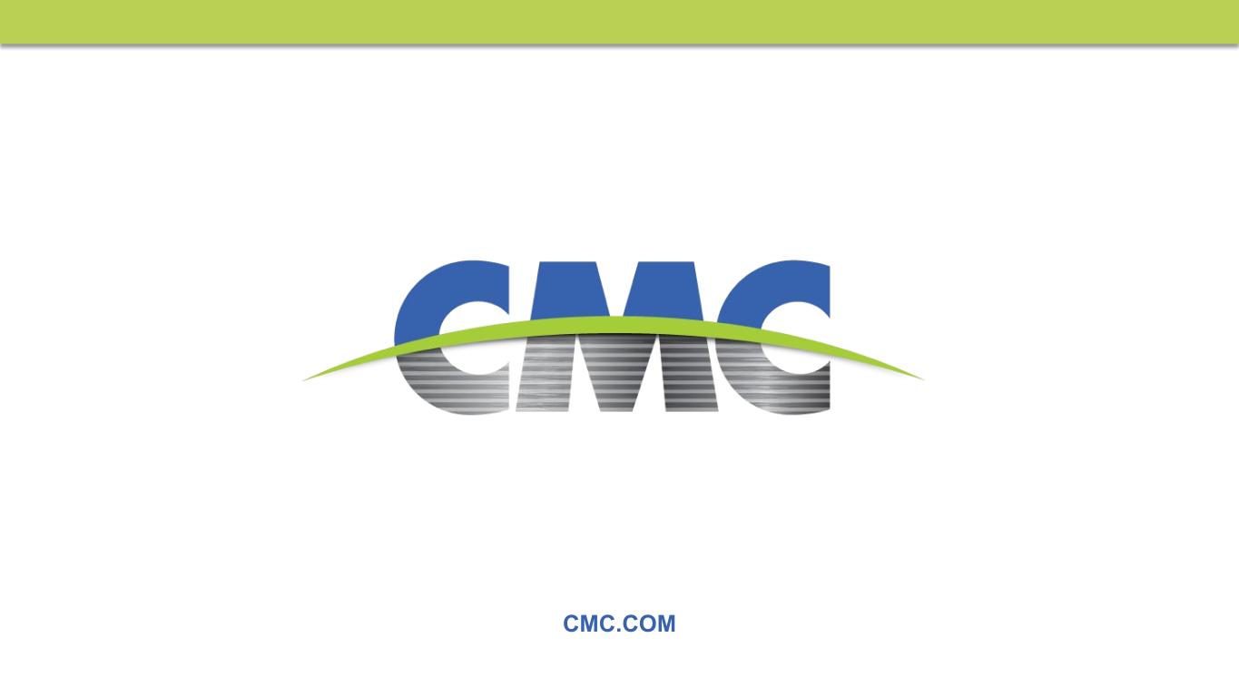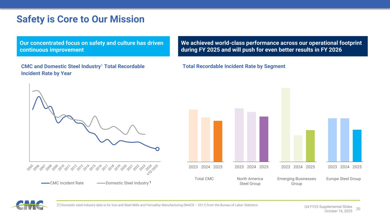 22Q4 FY25 Supplemental Slides │ October 16, 2025 Note: GHG emissions statistics for CMC include only steel mill operations, which represents over 95% of CMC’s emissions footprint Sources: CMC 2024 Sustainability Report; virgin material content for industry based on data from Bureau of International Recycling; all other industry data sourced from the World Steel Association Clear Sustainability Leader CMC plays a key role in the circular steel economy, turning end of life metals into the steel that forms the backbone of modern society Scopes 1&2 Greenhouse Gas Emissions (GHG) Intensity ACCOUNTABILITY FOR OUR ACTIONS RESPECT FOR OUR ENVIRONMENT ACTING WITH INTEGRITY2.2 1.8 1.0 0.42 Integrated Average Global Average U.S. Average CMCtC O 2e p er M T of s te el 1.18 28.60 CMCGlobal Industry 3.76 21.27 CMCGlobal Industry 0.73 1.92 CMCGlobal Industry Energy Intensity G J pe r M T of s te el Water Withdrawal Intensity Cu bi c m et er p er M T of s te el 2% 69% CMCGlobal Industry % o f s te el c on te nt Scopes 1-3 GHG Emissions Intensity tC O 2e p er M T of s te el Virgin Materials Used in Steelmaking