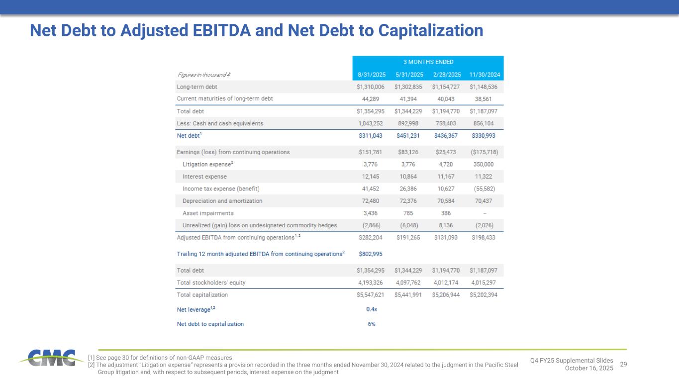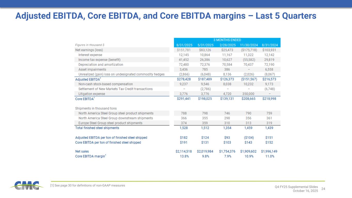 30 ADJUSTED EARNINGS Adjusted earnings is a non-GAAP financial measure that is equal to earnings (loss) before asset impairments, including the estimated income tax effects thereof. The adjustment “settlement for New Markets Tax Credit transaction” represents the recognition of deferred revenue from 2016 and 2017 resulting from the Company’s participation in the New Markets Tax Credit program provided for in the Community Renewal Tax Relief Act of 2000 during the development of a micro mill, spooler and T-post shop located in eligible zones as determined by the Internal Revenue Service. Adjusted earnings also excludes litigation expense and unrealized (gain) loss on undesignated commodity hedges. Adjusted earnings should not be considered as an alternative to net earnings (loss) or any other performance measure derived in accordance with GAAP. However, we believe that adjusted earnings provides relevant and useful information to investors as it allows: (i) a supplemental measure of our ongoing core performance and (ii) the assessment of period-to-period performance trends. Management uses adjusted earnings to evaluate our financial performance. Adjusted earnings may be inconsistent with similar measures presented by other companies. Adjusted earnings per diluted share (or adjusted EPS) is defined as adjusted earnings on a diluted per share basis. CORE EBITDA Core EBITDA is the sum of net earnings (loss) before interest expense and income taxes. It also excludes recurring non-cash charges for depreciation and amortization, asset impairments, amortization of acquired unfavorable contract backlog, and unrealized (gain) loss on undesignated commodity hedges. Core EBITDA also excludes litigation expense, settlement for New Market Tax Credit transactions, non-cash stock-based compensation, loss on debt extinguishments, gains on sale of assets, acquisition settlements, acquisition and integration related costs, and purchase accounting effect on inventory. The adjustment “litigation expense” represents a provision recorded in the three months ended November 30, 2024 related to the judgment in the Pacific Steel Group litigation and, with respect to subsequent periods, interest expense on the judgment amount. The adjustment “settlement for New Markets Tax Credit transaction” represents the recognition of deferred revenue from 2016 and 2017 resulting from the Company’s participation in the New Markets Tax Credit program provided for in the Community Renewal Tax Relief Act of 2000 during the development of a micro mill, spooler and T-post shop located in eligible zones as determined by the Internal Revenue Service. Core EBITDA should not be considered an alternative to earnings (loss) from continuing operations or net earnings (loss), or as a better measure of liquidity than net cash flows from operating activities, as determined by GAAP. However, we believe that Core EBITDA provides relevant and useful information, which is often used by analysts, creditors and other interested parties in our industry as it allows: (i) comparison of our earnings to those of our competitors; (ii) a supplemental measure of our ongoing core performance; and (iii) the assessment of period-to-period performance trends. Additionally, Core EBITDA is the target benchmark for our annual and long-term cash incentive performance plans for management. Core EBITDA may be inconsistent with similar measures presented by other companies. ADJUSTED EBITDA Adjusted EBITDA is a non-GAAP financial measure. Adjusted EBITDA is the sum of the Company’s net earnings (loss) before interest expense, income taxes, depreciation and amortization expense, asset impairments, amortization of acquired unfavorable contract backlog, and unrealized (gain) loss on undesignated commodity hedges. Adjusted EBITDA should not be considered as an alternative to net earnings (loss), or any other performance measure derived in accordance with GAAP. However, we believe that adjusted EBITDA provides relevant and useful information to investors as it allows: (i) a supplemental measure of our ongoing performance and (ii) the assessment of period-to-period performance trends. Management uses adjusted EBITDA to evaluate our financial performance. Adjusted EBITDA may be inconsistent with similar measures presented by other companies. During the fourth fiscal quarter of 2025, the Company modified its method of calculating adjusted EBITDA to exclude the impact of unrealized gains and losses on undesignated commodity derivatives. This change was primarily driven by heightened volatility in copper forward markets, which introduced significant non-cash fluctuations unrelated to core operations. By removing this volatility, the revised metric provides a more representative view of operating performance and cash-generating capability. Accordingly, the Company evaluated the impact of this change on prior-period disclosures and has recast adjusted EBITDA, core EBITDA, core EBITDA margin, adjusted earnings and adjusted earnings per diluted share for all periods presented in this presentation. DISCRETIONARY CASH FLOW Discretionary Cash Flow is defined as Adjusted EBITDA less depreciation and amortization (used as a proxy for sustaining capital expenditures) less interest expense, less net cash income taxes paid less dividend payments plus stock- based compensation plus a litigation-related loss associated with the PSG litigation. NET DEBT Net debt is defined as total debt less cash and cash equivalents. NET LEVERAGE Net leverage is defined as net debt divided by trailing 12 month adjusted EBITDA from continuing operations. RETURN ON INVESTED CAPITAL Return on Invested Capital is defined as: 1) after-tax operating profit divided by 2) total assets less cash & cash equivalents less non-interest-bearing liabilities. For annual measures, trailing 5-quarter averages are used for balance sheet figures. Q4 FY25 Supplemental Slides October 16, 2025 Definitions for non