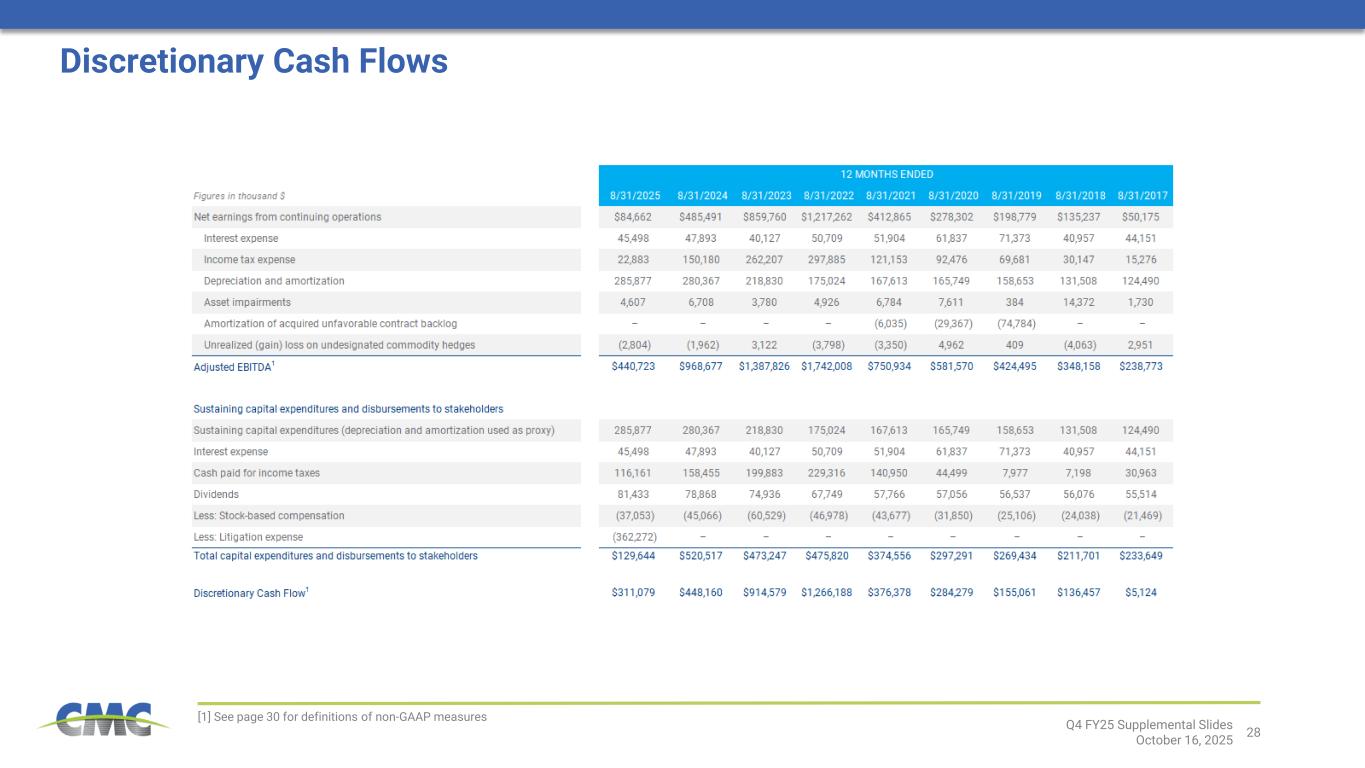 2Q4 FY25 Supplemental Slides October 16, 2025 Financial Information of CP&P and Foley; Pro Forma and Combined Company Measures This presentation contains unaudited financial information about CP&P and Foley, some of which reflects preliminary estimates and forecasts based on currently available information and management estimates. This presentation does not contain a comprehensive statement of CP&P’s or Foley’s respective actual financial results or position. Actual results may be different from this preliminary and/or forecasted information and any such changes may be material. Investors should not place undue reliance upon the preliminary estimates and forecasts. Estimates and forecasts are subject to risks and uncertainties, many of which are outside of management’s control. See “Forward-Looking Statements.” This presentation also includes pro forma and combined company forward-looking financial information that gives effect to the consummation of the acquisitions of CP&P and Foley (together, the “Acquisitions”). Pro forma and combined company forward-looking financial information included herein is presented for illustrative purposes only and is based upon available information that is preliminary in nature, as well as certain assumptions and estimates that we believe are reasonable. This pro forma and combined company forward-looking financial information may not necessarily reflect what our results of operations and financial position would have been had the Acquisitions occurred during the periods presented herein or what our results of operations and financial position will be in the future. The pro forma financial information presented herein has not been prepared and presented in accordance with the requirements of Regulation S-X. The assumptions and estimates underlying the combined company forward-looking financial information are inherently uncertain and are subject to a variety of significant business, economic and competitive risks and uncertainties that could cause actual results to differ materially from those contained in the prospective financial information, including the risks and uncertainties described under “Forward-Looking Statements” above. The Company’s auditors have not audited, reviewed, compiled or performed any procedures with respect to the accompanying financial information. Acquisition Risks Although certain information included in this presentation generally assumes consummation of the Acquisitions and we expect that the Acquisitions will result in benefits to the Company, we may be unable to consummate the Acquisitions on a timely basis or at all, and if the Acquisitions are consummated, we may not realize the anticipated benefits because of integration difficulties, increased debt and other challenges. The success of the Acquisitions will depend, in large part, on CMC’s ability to realize the anticipated benefits from the Acquisitions.