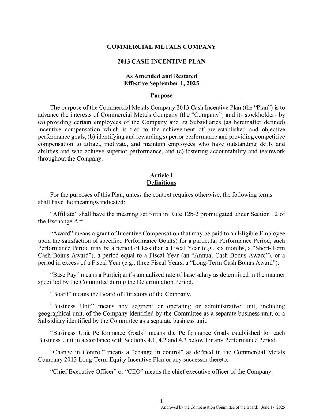 1 Approved by the Compensation Committee of the Board: June 17, 2025 COMMERCIAL METALS COMPANY 2013 CASH INCENTIVE PLAN As Amended and Restated Effective September 1, 2025 Purpose The purpose of the Commercial Metals Company 2013 Cash Incentive Plan (the “Plan”) is to advance the interests of Commercial Metals Company (the “Company”) and its stockholders by (a) providing certain employees of the Company and its Subsidiaries (as hereinafter defined) incentive compensation which is tied to the achievement of pre-established and objective performance goals, (b) identifying and rewarding superior performance and providing competitive compensation to attract, motivate, and maintain employees who have outstanding skills and abilities and who achieve superior performance, and (c) fostering accountability and teamwork throughout the Company. Article I Definitions For the purposes of this Plan, unless the context requires otherwise, the following terms shall have the meanings indicated: “Affiliate” shall have the meaning set forth in Rule 12b-2 promulgated under Section 12 of the Exchange Act. “Award” means a grant of Incentive Compensation that may be paid to an Eligible Employee upon the satisfaction of specified Performance Goal(s) for a particular Performance Period; such Performance Period may be a period of less than a Fiscal Year (e.g., six months, a “Short-Term Cash Bonus Award”), a period equal to a Fiscal Year (an “Annual Cash Bonus Award”), or a period in excess of a Fiscal Year (e.g., three Fiscal Years, a “Long-Term Cash Bonus Award”). “Base Pay” means a Participant’s annualized rate of base salary as determined in the manner specified by the Committee during the Determination Period. “Board” means the Board of Directors of the Company. “Business Unit” means any segment or operating or administrative unit, including geographical unit, of the Company identified by the Committee as a separate business unit, or a Subsidiary identified by the Committee as a separate business unit. “Business Unit Performance Goals” means the Performance Goals established for each Business Unit in accordance with Sections 4.1, 4.2 and 4.3 below for any Performance Period. “Change in Control” means a “change in control” as defined in the Commercial Metals Company 2013 Long-Term Equity Incentive Plan or any successor thereto. “Chief Executive Officer” or “CEO” means the chief executive officer of the Company.