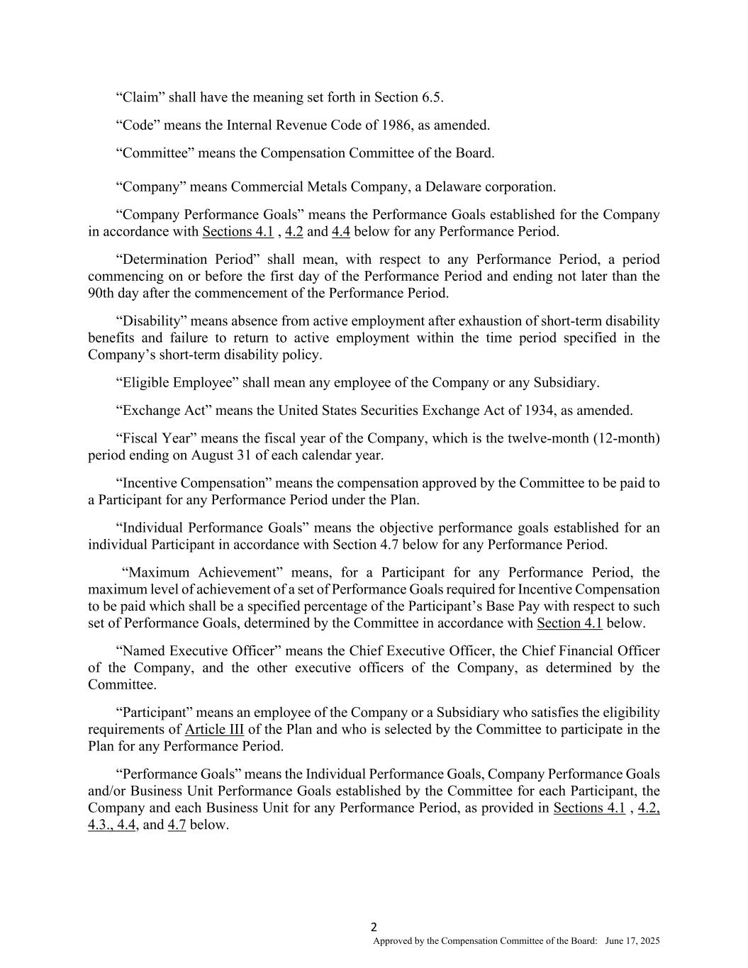 2 Approved by the Compensation Committee of the Board: June 17, 2025 “Claim” shall have the meaning set forth in Section 6.5. “Code” means the Internal Revenue Code of 1986, as amended. “Committee” means the Compensation Committee of the Board. “Company” means Commercial Metals Company, a Delaware corporation. “Company Performance Goals” means the Performance Goals established for the Company in accordance with Sections 4.1 , 4.2 and 4.4 below for any Performance Period. “Determination Period” shall mean, with respect to any Performance Period, a period commencing on or before the first day of the Performance Period and ending not later than the 90th day after the commencement of the Performance Period. “Disability” means absence from active employment after exhaustion of short-term disability benefits and failure to return to active employment within the time period specified in the Company’s short-term disability policy. “Eligible Employee” shall mean any employee of the Company or any Subsidiary. “Exchange Act” means the United States Securities Exchange Act of 1934, as amended. “Fiscal Year” means the fiscal year of the Company, which is the twelve-month (12-month) period ending on August 31 of each calendar year. “Incentive Compensation” means the compensation approved by the Committee to be paid to a Participant for any Performance Period under the Plan. “Individual Performance Goals” means the objective performance goals established for an individual Participant in accordance with Section 4.7 below for any Performance Period. “Maximum Achievement” means, for a Participant for any Performance Period, the maximum level of achievement of a set of Performance Goals required for Incentive Compensation to be paid which shall be a specified percentage of the Participant’s Base Pay with respect to such set of Performance Goals, determined by the Committee in accordance with Section 4.1 below. “Named Executive Officer” means the Chief Executive Officer, the Chief Financial Officer of the Company, and the other executive officers of the Company, as determined by the Committee. “Participant” means an employee of the Company or a Subsidiary who satisfies the eligibility requirements of Article III of the Plan and who is selected by the Committee to participate in the Plan for any Performance Period. “Performance Goals” means the Individual Performance Goals, Company Performance Goals and/or Business Unit Performance Goals established by the Committee for each Participant, the Company and each Business Unit for any Performance Period, as provided in Sections 4.1 , 4.2, 4.3., 4.4, and 4.7 below.