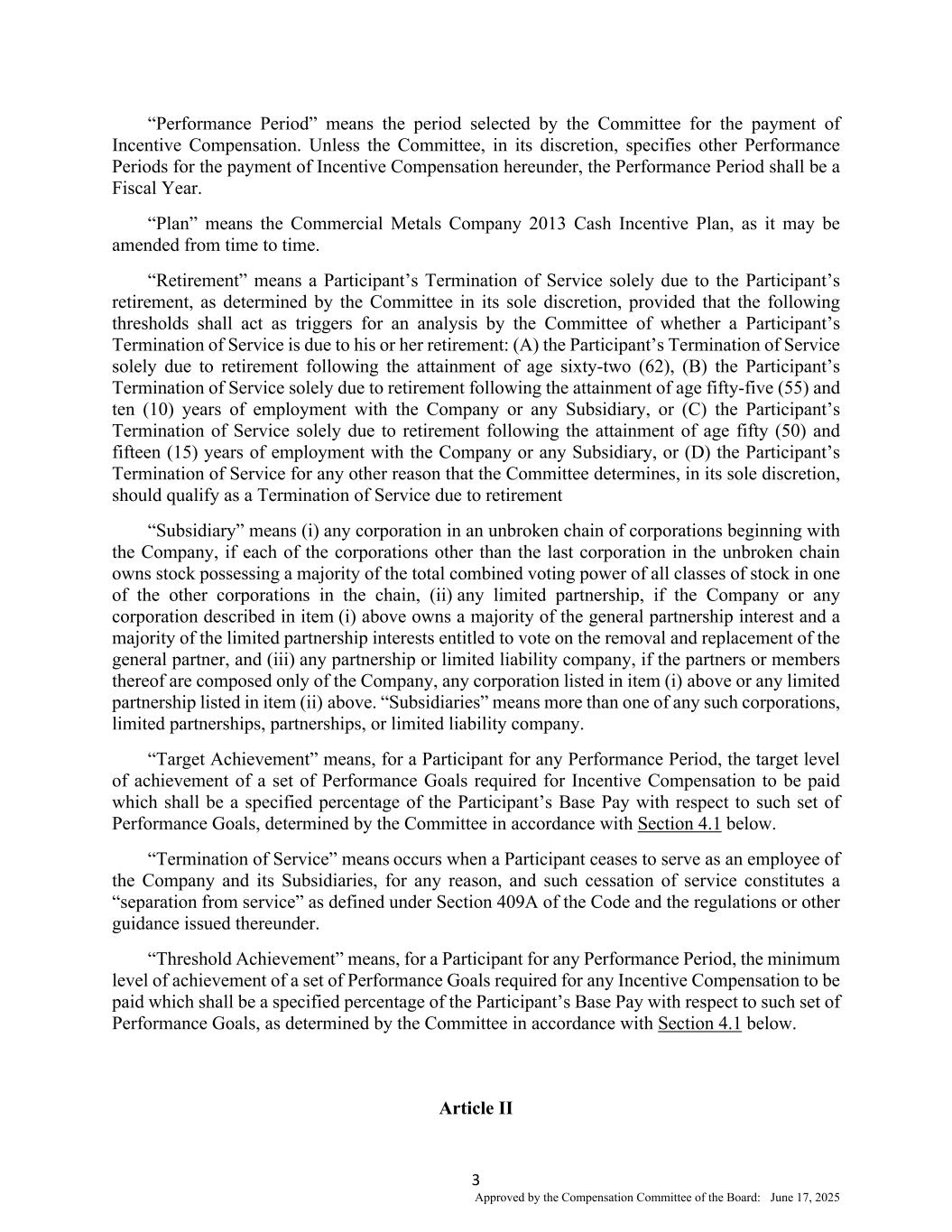 3 Approved by the Compensation Committee of the Board: June 17, 2025 “Performance Period” means the period selected by the Committee for the payment of Incentive Compensation. Unless the Committee, in its discretion, specifies other Performance Periods for the payment of Incentive Compensation hereunder, the Performance Period shall be a Fiscal Year. “Plan” means the Commercial Metals Company 2013 Cash Incentive Plan, as it may be amended from time to time. “Retirement” means a Participant’s Termination of Service solely due to the Participant’s retirement, as determined by the Committee in its sole discretion, provided that the following thresholds shall act as triggers for an analysis by the Committee of whether a Participant’s Termination of Service is due to his or her retirement: (A) the Participant’s Termination of Service solely due to retirement following the attainment of age sixty-two (62), (B) the Participant’s Termination of Service solely due to retirement following the attainment of age fifty-five (55) and ten (10) years of employment with the Company or any Subsidiary, or (C) the Participant’s Termination of Service solely due to retirement following the attainment of age fifty (50) and fifteen (15) years of employment with the Company or any Subsidiary, or (D) the Participant’s Termination of Service for any other reason that the Committee determines, in its sole discretion, should qualify as a Termination of Service due to retirement “Subsidiary” means (i) any corporation in an unbroken chain of corporations beginning with the Company, if each of the corporations other than the last corporation in the unbroken chain owns stock possessing a majority of the total combined voting power of all classes of stock in one of the other corporations in the chain, (ii) any limited partnership, if the Company or any corporation described in item (i) above owns a majority of the general partnership interest and a majority of the limited partnership interests entitled to vote on the removal and replacement of the general partner, and (iii) any partnership or limited liability company, if the partners or members thereof are composed only of the Company, any corporation listed in item (i) above or any limited partnership listed in item (ii) above. “Subsidiaries” means more than one of any such corporations, limited partnerships, partnerships, or limited liability company. “Target Achievement” means, for a Participant for any Performance Period, the target level of achievement of a set of Performance Goals required for Incentive Compensation to be paid which shall be a specified percentage of the Participant’s Base Pay with respect to such set of Performance Goals, determined by the Committee in accordance with Section 4.1 below. “Termination of Service” means occurs when a Participant ceases to serve as an employee of the Company and its Subsidiaries, for any reason, and such cessation of service constitutes a “separation from service” as defined under Section 409A of the Code and the regulations or other guidance issued thereunder. “Threshold Achievement” means, for a Participant for any Performance Period, the minimum level of achievement of a set of Performance Goals required for any Incentive Compensation to be paid which shall be a specified percentage of the Participant’s Base Pay with respect to such set of Performance Goals, as determined by the Committee in accordance with Section 4.1 below. Article II