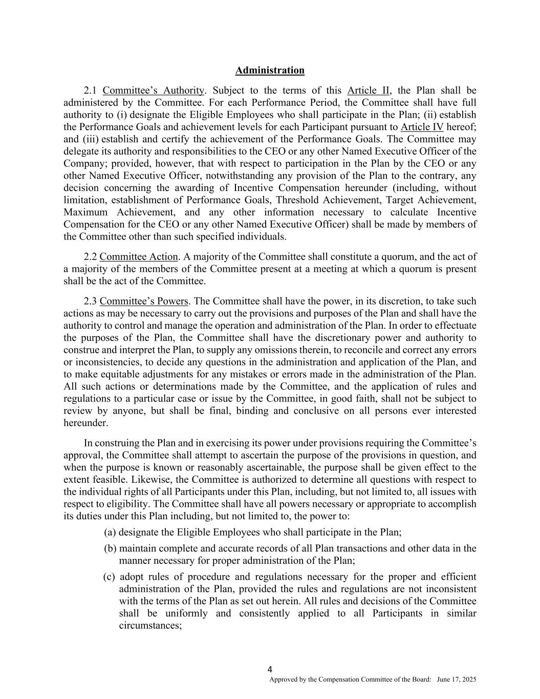 4 Approved by the Compensation Committee of the Board: June 17, 2025 Administration 2.1 Committee’s Authority. Subject to the terms of this Article II, the Plan shall be administered by the Committee. For each Performance Period, the Committee shall have full authority to (i) designate the Eligible Employees who shall participate in the Plan; (ii) establish the Performance Goals and achievement levels for each Participant pursuant to Article IV hereof; and (iii) establish and certify the achievement of the Performance Goals. The Committee may delegate its authority and responsibilities to the CEO or any other Named Executive Officer of the Company; provided, however, that with respect to participation in the Plan by the CEO or any other Named Executive Officer, notwithstanding any provision of the Plan to the contrary, any decision concerning the awarding of Incentive Compensation hereunder (including, without limitation, establishment of Performance Goals, Threshold Achievement, Target Achievement, Maximum Achievement, and any other information necessary to calculate Incentive Compensation for the CEO or any other Named Executive Officer) shall be made by members of the Committee other than such specified individuals. 2.2 Committee Action. A majority of the Committee shall constitute a quorum, and the act of a majority of the members of the Committee present at a meeting at which a quorum is present shall be the act of the Committee. 2.3 Committee’s Powers. The Committee shall have the power, in its discretion, to take such actions as may be necessary to carry out the provisions and purposes of the Plan and shall have the authority to control and manage the operation and administration of the Plan. In order to effectuate the purposes of the Plan, the Committee shall have the discretionary power and authority to construe and interpret the Plan, to supply any omissions therein, to reconcile and correct any errors or inconsistencies, to decide any questions in the administration and application of the Plan, and to make equitable adjustments for any mistakes or errors made in the administration of the Plan. All such actions or determinations made by the Committee, and the application of rules and regulations to a particular case or issue by the Committee, in good faith, shall not be subject to review by anyone, but shall be final, binding and conclusive on all persons ever interested hereunder. In construing the Plan and in exercising its power under provisions requiring the Committee’s approval, the Committee shall attempt to ascertain the purpose of the provisions in question, and when the purpose is known or reasonably ascertainable, the purpose shall be given effect to the extent feasible. Likewise, the Committee is authorized to determine all questions with respect to the individual rights of all Participants under this Plan, including, but not limited to, all issues with respect to eligibility. The Committee shall have all powers necessary or appropriate to accomplish its duties under this Plan including, but not limited to, the power to: (a) designate the Eligible Employees who shall participate in the Plan; (b) maintain complete and accurate records of all Plan transactions and other data in the manner necessary for proper administration of the Plan; (c) adopt rules of procedure and regulations necessary for the proper and efficient administration of the Plan, provided the rules and regulations are not inconsistent with the terms of the Plan as set out herein. All rules and decisions of the Committee shall be uniformly and consistently applied to all Participants in similar circumstances;