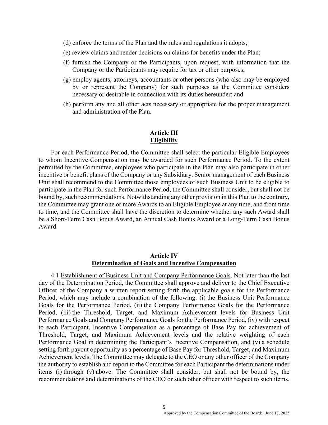 5 Approved by the Compensation Committee of the Board: June 17, 2025 (d) enforce the terms of the Plan and the rules and regulations it adopts; (e) review claims and render decisions on claims for benefits under the Plan; (f) furnish the Company or the Participants, upon request, with information that the Company or the Participants may require for tax or other purposes; (g) employ agents, attorneys, accountants or other persons (who also may be employed by or represent the Company) for such purposes as the Committee considers necessary or desirable in connection with its duties hereunder; and (h) perform any and all other acts necessary or appropriate for the proper management and administration of the Plan. Article III Eligibility For each Performance Period, the Committee shall select the particular Eligible Employees to whom Incentive Compensation may be awarded for such Performance Period. To the extent permitted by the Committee, employees who participate in the Plan may also participate in other incentive or benefit plans of the Company or any Subsidiary. Senior management of each Business Unit shall recommend to the Committee those employees of such Business Unit to be eligible to participate in the Plan for such Performance Period; the Committee shall consider, but shall not be bound by, such recommendations. Notwithstanding any other provision in this Plan to the contrary, the Committee may grant one or more Awards to an Eligible Employee at any time, and from time to time, and the Committee shall have the discretion to determine whether any such Award shall be a Short-Term Cash Bonus Award, an Annual Cash Bonus Award or a Long-Term Cash Bonus Award. Article IV Determination of Goals and Incentive Compensation 4.1 Establishment of Business Unit and Company Performance Goals. Not later than the last day of the Determination Period, the Committee shall approve and deliver to the Chief Executive Officer of the Company a written report setting forth the applicable goals for the Performance Period, which may include a combination of the following: (i) the Business Unit Performance Goals for the Performance Period, (ii) the Company Performance Goals for the Performance Period, (iii) the Threshold, Target, and Maximum Achievement levels for Business Unit Performance Goals and Company Performance Goals for the Performance Period, (iv) with respect to each Participant, Incentive Compensation as a percentage of Base Pay for achievement of Threshold, Target, and Maximum Achievement levels and the relative weighting of each Performance Goal in determining the Participant’s Incentive Compensation, and (v) a schedule setting forth payout opportunity as a percentage of Base Pay for Threshold, Target, and Maximum Achievement levels. The Committee may delegate to the CEO or any other officer of the Company the authority to establish and report to the Committee for each Participant the determinations under items (i) through (v) above. The Committee shall consider, but shall not be bound by, the recommendations and determinations of the CEO or such other officer with respect to such items.