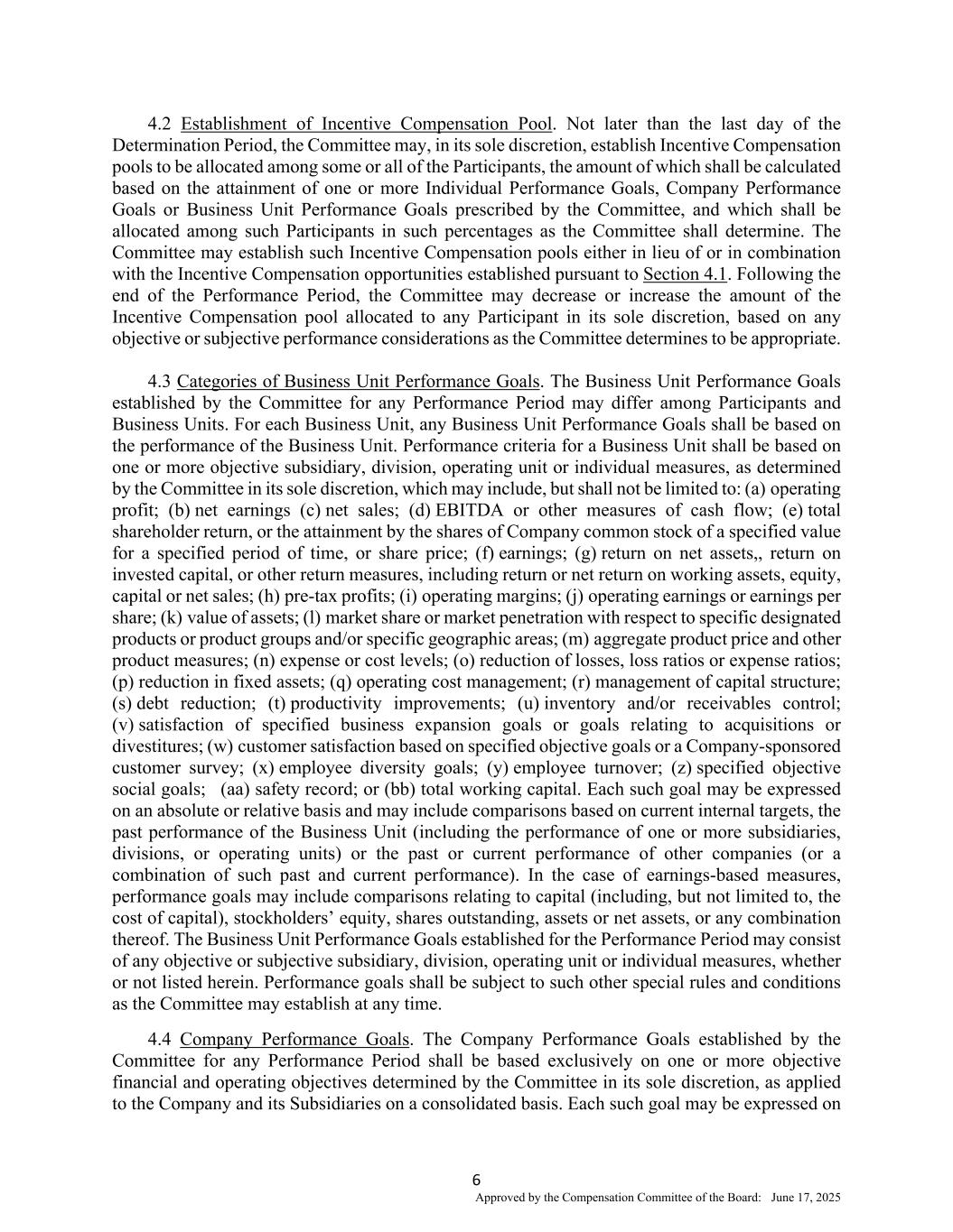 6 Approved by the Compensation Committee of the Board: June 17, 2025 4.2 Establishment of Incentive Compensation Pool. Not later than the last day of the Determination Period, the Committee may, in its sole discretion, establish Incentive Compensation pools to be allocated among some or all of the Participants, the amount of which shall be calculated based on the attainment of one or more Individual Performance Goals, Company Performance Goals or Business Unit Performance Goals prescribed by the Committee, and which shall be allocated among such Participants in such percentages as the Committee shall determine. The Committee may establish such Incentive Compensation pools either in lieu of or in combination with the Incentive Compensation opportunities established pursuant to Section 4.1. Following the end of the Performance Period, the Committee may decrease or increase the amount of the Incentive Compensation pool allocated to any Participant in its sole discretion, based on any objective or subjective performance considerations as the Committee determines to be appropriate. 4.3 Categories of Business Unit Performance Goals. The Business Unit Performance Goals established by the Committee for any Performance Period may differ among Participants and Business Units. For each Business Unit, any Business Unit Performance Goals shall be based on the performance of the Business Unit. Performance criteria for a Business Unit shall be based on one or more objective subsidiary, division, operating unit or individual measures, as determined by the Committee in its sole discretion, which may include, but shall not be limited to: (a) operating profit; (b) net earnings (c) net sales; (d) EBITDA or other measures of cash flow; (e) total shareholder return, or the attainment by the shares of Company common stock of a specified value for a specified period of time, or share price; (f) earnings; (g) return on net assets,, return on invested capital, or other return measures, including return or net return on working assets, equity, capital or net sales; (h) pre-tax profits; (i) operating margins; (j) operating earnings or earnings per share; (k) value of assets; (l) market share or market penetration with respect to specific designated products or product groups and/or specific geographic areas; (m) aggregate product price and other product measures; (n) expense or cost levels; (o) reduction of losses, loss ratios or expense ratios; (p) reduction in fixed assets; (q) operating cost management; (r) management of capital structure; (s) debt reduction; (t) productivity improvements; (u) inventory and/or receivables control; (v) satisfaction of specified business expansion goals or goals relating to acquisitions or divestitures; (w) customer satisfaction based on specified objective goals or a Company-sponsored customer survey; (x) employee diversity goals; (y) employee turnover; (z) specified objective social goals; (aa) safety record; or (bb) total working capital. Each such goal may be expressed on an absolute or relative basis and may include comparisons based on current internal targets, the past performance of the Business Unit (including the performance of one or more subsidiaries, divisions, or operating units) or the past or current performance of other companies (or a combination of such past and current performance). In the case of earnings-based measures, performance goals may include comparisons relating to capital (including, but not limited to, the cost of capital), stockholders’ equity, shares outstanding, assets or net assets, or any combination thereof. The Business Unit Performance Goals established for the Performance Period may consist of any objective or subjective subsidiary, division, operating unit or individual measures, whether or not listed herein. Performance goals shall be subject to such other special rules and conditions as the Committee may establish at any time. 4.4 Company Performance Goals. The Company Performance Goals established by the Committee for any Performance Period shall be based exclusively on one or more objective financial and operating objectives determined by the Committee in its sole discretion, as applied to the Company and its Subsidiaries on a consolidated basis. Each such goal may be expressed on