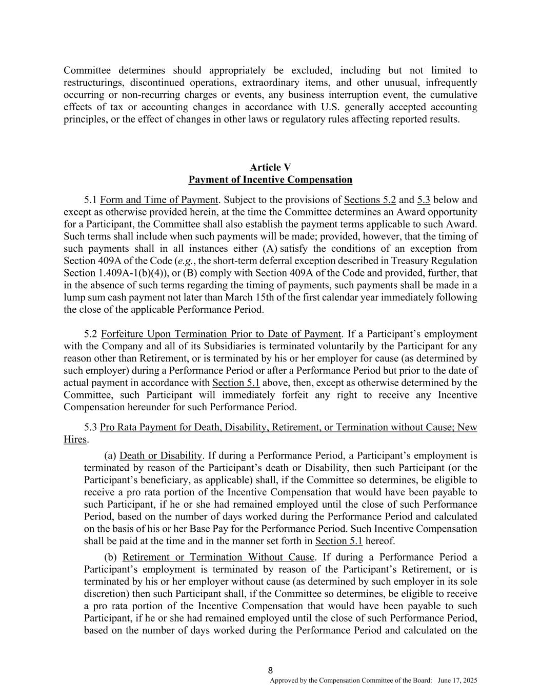8 Approved by the Compensation Committee of the Board: June 17, 2025 Committee determines should appropriately be excluded, including but not limited to restructurings, discontinued operations, extraordinary items, and other unusual, infrequently occurring or non-recurring charges or events, any business interruption event, the cumulative effects of tax or accounting changes in accordance with U.S. generally accepted accounting principles, or the effect of changes in other laws or regulatory rules affecting reported results. Article V Payment of Incentive Compensation 5.1 Form and Time of Payment. Subject to the provisions of Sections 5.2 and 5.3 below and except as otherwise provided herein, at the time the Committee determines an Award opportunity for a Participant, the Committee shall also establish the payment terms applicable to such Award. Such terms shall include when such payments will be made; provided, however, that the timing of such payments shall in all instances either (A) satisfy the conditions of an exception from Section 409A of the Code (e.g., the short-term deferral exception described in Treasury Regulation Section 1.409A-1(b)(4)), or (B) comply with Section 409A of the Code and provided, further, that in the absence of such terms regarding the timing of payments, such payments shall be made in a lump sum cash payment not later than March 15th of the first calendar year immediately following the close of the applicable Performance Period. 5.2 Forfeiture Upon Termination Prior to Date of Payment. If a Participant’s employment with the Company and all of its Subsidiaries is terminated voluntarily by the Participant for any reason other than Retirement, or is terminated by his or her employer for cause (as determined by such employer) during a Performance Period or after a Performance Period but prior to the date of actual payment in accordance with Section 5.1 above, then, except as otherwise determined by the Committee, such Participant will immediately forfeit any right to receive any Incentive Compensation hereunder for such Performance Period. 5.3 Pro Rata Payment for Death, Disability, Retirement, or Termination without Cause; New Hires. (a) Death or Disability. If during a Performance Period, a Participant’s employment is terminated by reason of the Participant’s death or Disability, then such Participant (or the Participant’s beneficiary, as applicable) shall, if the Committee so determines, be eligible to receive a pro rata portion of the Incentive Compensation that would have been payable to such Participant, if he or she had remained employed until the close of such Performance Period, based on the number of days worked during the Performance Period and calculated on the basis of his or her Base Pay for the Performance Period. Such Incentive Compensation shall be paid at the time and in the manner set forth in Section 5.1 hereof. (b) Retirement or Termination Without Cause. If during a Performance Period a Participant’s employment is terminated by reason of the Participant’s Retirement, or is terminated by his or her employer without cause (as determined by such employer in its sole discretion) then such Participant shall, if the Committee so determines, be eligible to receive a pro rata portion of the Incentive Compensation that would have been payable to such Participant, if he or she had remained employed until the close of such Performance Period, based on the number of days worked during the Performance Period and calculated on the