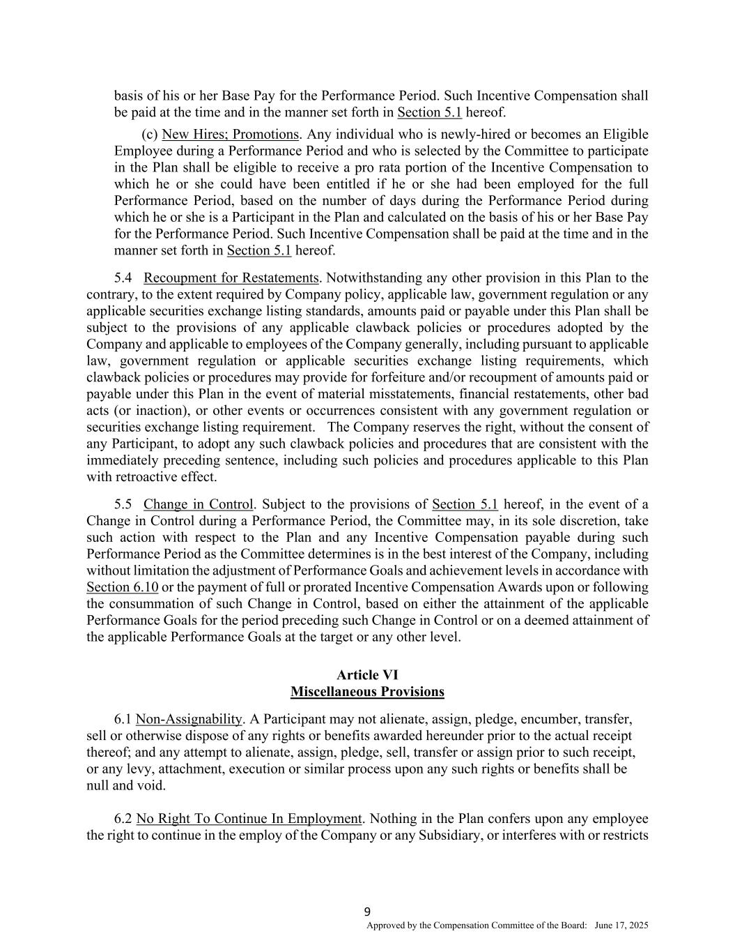 9 Approved by the Compensation Committee of the Board: June 17, 2025 basis of his or her Base Pay for the Performance Period. Such Incentive Compensation shall be paid at the time and in the manner set forth in Section 5.1 hereof. (c) New Hires; Promotions. Any individual who is newly-hired or becomes an Eligible Employee during a Performance Period and who is selected by the Committee to participate in the Plan shall be eligible to receive a pro rata portion of the Incentive Compensation to which he or she could have been entitled if he or she had been employed for the full Performance Period, based on the number of days during the Performance Period during which he or she is a Participant in the Plan and calculated on the basis of his or her Base Pay for the Performance Period. Such Incentive Compensation shall be paid at the time and in the manner set forth in Section 5.1 hereof. 5.4 Recoupment for Restatements. Notwithstanding any other provision in this Plan to the contrary, to the extent required by Company policy, applicable law, government regulation or any applicable securities exchange listing standards, amounts paid or payable under this Plan shall be subject to the provisions of any applicable clawback policies or procedures adopted by the Company and applicable to employees of the Company generally, including pursuant to applicable law, government regulation or applicable securities exchange listing requirements, which clawback policies or procedures may provide for forfeiture and/or recoupment of amounts paid or payable under this Plan in the event of material misstatements, financial restatements, other bad acts (or inaction), or other events or occurrences consistent with any government regulation or securities exchange listing requirement. The Company reserves the right, without the consent of any Participant, to adopt any such clawback policies and procedures that are consistent with the immediately preceding sentence, including such policies and procedures applicable to this Plan with retroactive effect. 5.5 Change in Control. Subject to the provisions of Section 5.1 hereof, in the event of a Change in Control during a Performance Period, the Committee may, in its sole discretion, take such action with respect to the Plan and any Incentive Compensation payable during such Performance Period as the Committee determines is in the best interest of the Company, including without limitation the adjustment of Performance Goals and achievement levels in accordance with Section 6.10 or the payment of full or prorated Incentive Compensation Awards upon or following the consummation of such Change in Control, based on either the attainment of the applicable Performance Goals for the period preceding such Change in Control or on a deemed attainment of the applicable Performance Goals at the target or any other level. Article VI Miscellaneous Provisions 6.1 Non-Assignability. A Participant may not alienate, assign, pledge, encumber, transfer, sell or otherwise dispose of any rights or benefits awarded hereunder prior to the actual receipt thereof; and any attempt to alienate, assign, pledge, sell, transfer or assign prior to such receipt, or any levy, attachment, execution or similar process upon any such rights or benefits shall be null and void. 6.2 No Right To Continue In Employment. Nothing in the Plan confers upon any employee the right to continue in the employ of the Company or any Subsidiary, or interferes with or restricts