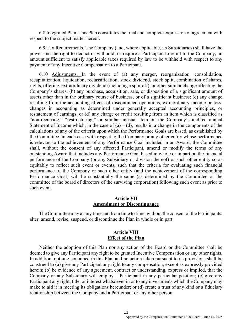 11 Approved by the Compensation Committee of the Board: June 17, 2025 6.8 Integrated Plan. This Plan constitutes the final and complete expression of agreement with respect to the subject matter hereof. 6.9 Tax Requirements. The Company (and, where applicable, its Subsidiaries) shall have the power and the right to deduct or withhold, or require a Participant to remit to the Company, an amount sufficient to satisfy applicable taxes required by law to be withheld with respect to any payment of any Incentive Compensation to a Participant. 6.10 Adjustments. In the event of (a) any merger, reorganization, consolidation, recapitalization, liquidation, reclassification, stock dividend, stock split, combination of shares, rights, offering, extraordinary dividend (including a spin-off), or other similar change affecting the Company’s shares; (b) any purchase, acquisition, sale, or disposition of a significant amount of assets other than in the ordinary course of business, or of a significant business; (c) any change resulting from the accounting effects of discontinued operations, extraordinary income or loss, changes in accounting as determined under generally accepted accounting principles, or restatement of earnings; or (d) any charge or credit resulting from an item which is classified as “non-recurring,” “restructuring,” or similar unusual item on the Company’s audited annual Statement of Income which, in the case of (a) – (d), results in a change in the components of the calculations of any of the criteria upon which the Performance Goals are based, as established by the Committee, in each case with respect to the Company or any other entity whose performance is relevant to the achievement of any Performance Goal included in an Award, the Committee shall, without the consent of any affected Participant, amend or modify the terms of any outstanding Award that includes any Performance Goal based in whole or in part on the financial performance of the Company (or any Subsidiary or division thereof) or such other entity so as equitably to reflect such event or events, such that the criteria for evaluating such financial performance of the Company or such other entity (and the achievement of the corresponding Performance Goal) will be substantially the same (as determined by the Committee or the committee of the board of directors of the surviving corporation) following such event as prior to such event. Article VII Amendment or Discontinuance The Committee may at any time and from time to time, without the consent of the Participants, alter, amend, revise, suspend, or discontinue the Plan in whole or in part. Article VIII Effect of the Plan Neither the adoption of this Plan nor any action of the Board or the Committee shall be deemed to give any Participant any right to be granted Incentive Compensation or any other rights. In addition, nothing contained in this Plan and no action taken pursuant to its provisions shall be construed to (a) give any Participant any right to any compensation, except as expressly provided herein; (b) be evidence of any agreement, contract or understanding, express or implied, that the Company or any Subsidiary will employ a Participant in any particular position; (c) give any Participant any right, title, or interest whatsoever in or to any investments which the Company may make to aid it in meeting its obligations hereunder; or (d) create a trust of any kind or a fiduciary relationship between the Company and a Participant or any other person.