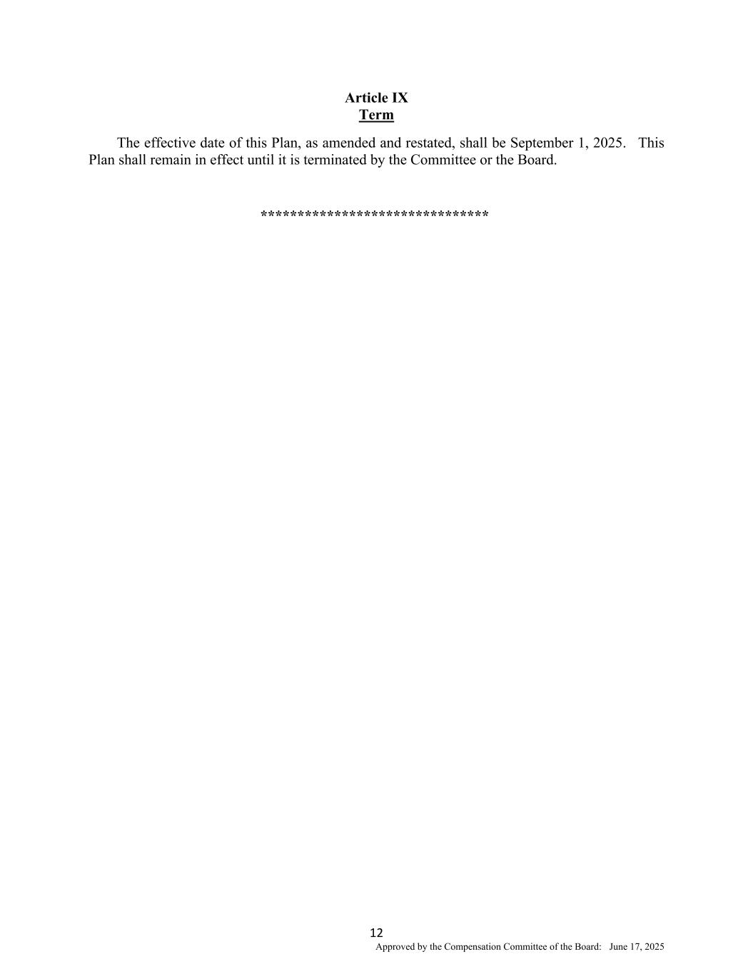 12 Approved by the Compensation Committee of the Board: June 17, 2025 Article IX Term The effective date of this Plan, as amended and restated, shall be September 1, 2025. This Plan shall remain in effect until it is terminated by the Committee or the Board. *******************************
