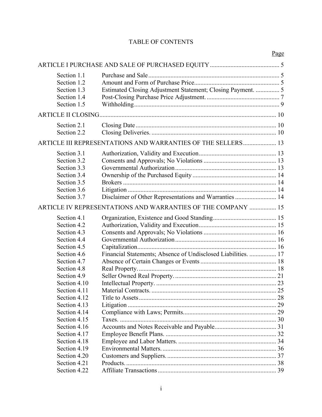 i TABLE OF CONTENTS Page ARTICLE I PURCHASE AND SALE OF PURCHASED EQUITY ............................................ 5 Section 1.1 Purchase and Sale ................................................................................... 5 Section 1.2 Amount and Form of Purchase Price...................................................... 5 Section 1.3 Estimated Closing Adjustment Statement; Closing Payment. ............... 5 Section 1.4 Post-Closing Purchase Price Adjustment. .............................................. 7 Section 1.5 Withholding ............................................................................................ 9 ARTICLE II CLOSING ................................................................................................................ 10 Section 2.1 Closing Date ......................................................................................... 10 Section 2.2 Closing Deliveries. ............................................................................... 10 ARTICLE III REPRESENTATIONS AND WARRANTIES OF THE SELLERS ..................... 13 Section 3.1 Authorization, Validity and Execution ................................................. 13 Section 3.2 Consents and Approvals; No Violations .............................................. 13 Section 3.3 Governmental Authorization ................................................................ 13 Section 3.4 Ownership of the Purchased Equity ..................................................... 14 Section 3.5 Brokers ................................................................................................. 14 Section 3.6 Litigation .............................................................................................. 14 Section 3.7 Disclaimer of Other Representations and Warranties .......................... 14 ARTICLE IV REPRESENTATIONS AND WARRANTIES OF THE COMPANY ................. 15 Section 4.1 Organization, Existence and Good Standing ........................................ 15 Section 4.2 Authorization, Validity and Execution ................................................. 15 Section 4.3 Consents and Approvals; No Violations .............................................. 16 Section 4.4 Governmental Authorization ................................................................ 16 Section 4.5 Capitalization ........................................................................................ 16 Section 4.6 Financial Statements; Absence of Undisclosed Liabilities. ................. 17 Section 4.7 Absence of Certain Changes or Events ................................................ 18 Section 4.8 Real Property. ....................................................................................... 18 Section 4.9 Seller Owned Real Property. ................................................................ 21 Section 4.10 Intellectual Property. ............................................................................ 23 Section 4.11 Material Contracts. ............................................................................... 25 Section 4.12 Title to Assets ....................................................................................... 28 Section 4.13 Litigation .............................................................................................. 29 Section 4.14 Compliance with Laws; Permits. .......................................................... 29 Section 4.15 Taxes. ................................................................................................... 30 Section 4.16 Accounts and Notes Receivable and Payable. ...................................... 31 Section 4.17 Employee Benefit Plans. ...................................................................... 32 Section 4.18 Employee and Labor Matters. .............................................................. 34 Section 4.19 Environmental Matters. ........................................................................ 36 Section 4.20 Customers and Suppliers. ..................................................................... 37 Section 4.21 Products. ............................................................................................... 38 Section 4.22 Affiliate Transactions ........................................................................... 39