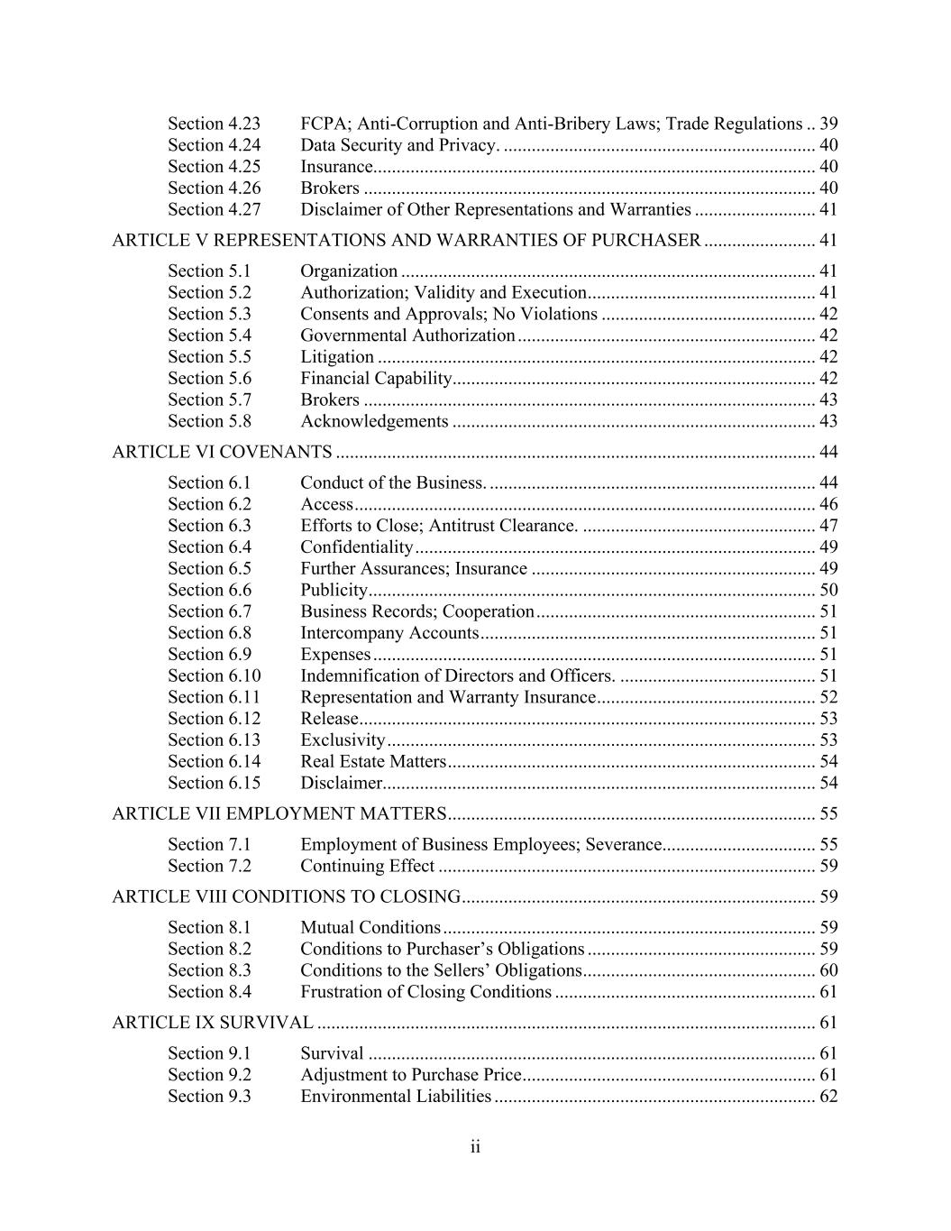 ii Section 4.23 FCPA; Anti-Corruption and Anti-Bribery Laws; Trade Regulations .. 39 Section 4.24 Data Security and Privacy. ................................................................... 40 Section 4.25 Insurance............................................................................................... 40 Section 4.26 Brokers ................................................................................................. 40 Section 4.27 Disclaimer of Other Representations and Warranties .......................... 41 ARTICLE V REPRESENTATIONS AND WARRANTIES OF PURCHASER ........................ 41 Section 5.1 Organization ......................................................................................... 41 Section 5.2 Authorization; Validity and Execution ................................................. 41 Section 5.3 Consents and Approvals; No Violations .............................................. 42 Section 5.4 Governmental Authorization ................................................................ 42 Section 5.5 Litigation .............................................................................................. 42 Section 5.6 Financial Capability.............................................................................. 42 Section 5.7 Brokers ................................................................................................. 43 Section 5.8 Acknowledgements .............................................................................. 43 ARTICLE VI COVENANTS ....................................................................................................... 44 Section 6.1 Conduct of the Business. ...................................................................... 44 Section 6.2 Access ................................................................................................... 46 Section 6.3 Efforts to Close; Antitrust Clearance. .................................................. 47 Section 6.4 Confidentiality ...................................................................................... 49 Section 6.5 Further Assurances; Insurance ............................................................. 49 Section 6.6 Publicity ................................................................................................ 50 Section 6.7 Business Records; Cooperation ............................................................ 51 Section 6.8 Intercompany Accounts ........................................................................ 51 Section 6.9 Expenses ............................................................................................... 51 Section 6.10 Indemnification of Directors and Officers. .......................................... 51 Section 6.11 Representation and Warranty Insurance ............................................... 52 Section 6.12 Release .................................................................................................. 53 Section 6.13 Exclusivity ............................................................................................ 53 Section 6.14 Real Estate Matters ............................................................................... 54 Section 6.15 Disclaimer............................................................................................. 54 ARTICLE VII EMPLOYMENT MATTERS ............................................................................... 55 Section 7.1 Employment of Business Employees; Severance................................. 55 Section 7.2 Continuing Effect ................................................................................. 59 ARTICLE VIII CONDITIONS TO CLOSING ............................................................................ 59 Section 8.1 Mutual Conditions ................................................................................ 59 Section 8.2 Conditions to Purchaser’s Obligations ................................................. 59 Section 8.3 Conditions to the Sellers’ Obligations .................................................. 60 Section 8.4 Frustration of Closing Conditions ........................................................ 61 ARTICLE IX SURVIVAL ........................................................................................................... 61 Section 9.1 Survival ................................................................................................ 61 Section 9.2 Adjustment to Purchase Price ............................................................... 61 Section 9.3 Environmental Liabilities ..................................................................... 62