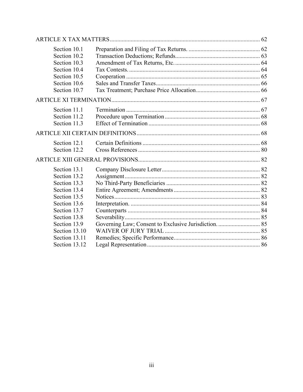 iii ARTICLE X TAX MATTERS ..................................................................................................... 62 Section 10.1 Preparation and Filing of Tax Returns. ................................................ 62 Section 10.2 Transaction Deductions; Refunds......................................................... 63 Section 10.3 Amendment of Tax Returns, Etc. ......................................................... 64 Section 10.4 Tax Contests. ........................................................................................ 64 Section 10.5 Cooperation .......................................................................................... 65 Section 10.6 Sales and Transfer Taxes ...................................................................... 66 Section 10.7 Tax Treatment; Purchase Price Allocation ........................................... 66 ARTICLE XI TERMINATION .................................................................................................... 67 Section 11.1 Termination .......................................................................................... 67 Section 11.2 Procedure upon Termination ................................................................ 68 Section 11.3 Effect of Termination ........................................................................... 68 ARTICLE XII CERTAIN DEFINITIONS ................................................................................... 68 Section 12.1 Certain Definitions ............................................................................... 68 Section 12.2 Cross References .................................................................................. 80 ARTICLE XIII GENERAL PROVISIONS .................................................................................. 82 Section 13.1 Company Disclosure Letter .................................................................. 82 Section 13.2 Assignment ........................................................................................... 82 Section 13.3 No Third-Party Beneficiaries ............................................................... 82 Section 13.4 Entire Agreement; Amendments .......................................................... 82 Section 13.5 Notices .................................................................................................. 83 Section 13.6 Interpretation. ....................................................................................... 84 Section 13.7 Counterparts ......................................................................................... 84 Section 13.8 Severability ........................................................................................... 85 Section 13.9 Governing Law; Consent to Exclusive Jurisdiction. ............................ 85 Section 13.10 WAIVER OF JURY TRIAL ................................................................ 85 Section 13.11 Remedies; Specific Performance. ......................................................... 86 Section 13.12 Legal Representation ............................................................................ 86