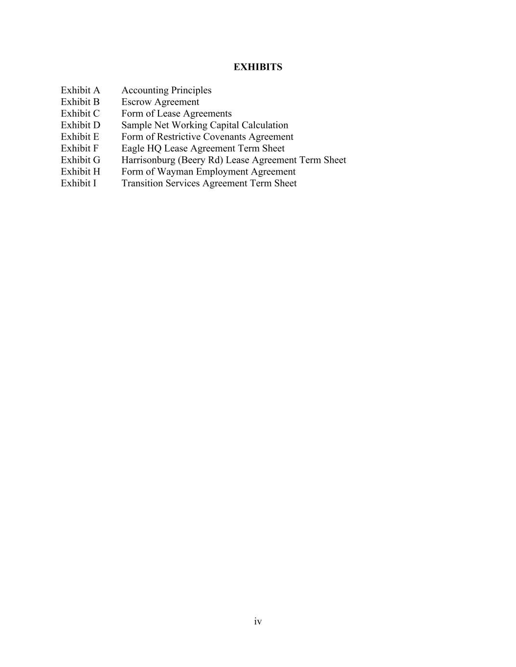 iv EXHIBITS Exhibit A Accounting Principles Exhibit B Escrow Agreement Exhibit C Form of Lease Agreements Exhibit D Sample Net Working Capital Calculation Exhibit E Form of Restrictive Covenants Agreement Exhibit F Eagle HQ Lease Agreement Term Sheet Exhibit G Harrisonburg (Beery Rd) Lease Agreement Term Sheet Exhibit H Form of Wayman Employment Agreement Exhibit I Transition Services Agreement Term Sheet