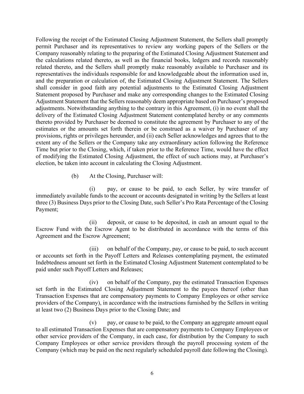 6 Following the receipt of the Estimated Closing Adjustment Statement, the Sellers shall promptly permit Purchaser and its representatives to review any working papers of the Sellers or the Company reasonably relating to the preparing of the Estimated Closing Adjustment Statement and the calculations related thereto, as well as the financial books, ledgers and records reasonably related thereto, and the Sellers shall promptly make reasonably available to Purchaser and its representatives the individuals responsible for and knowledgeable about the information used in, and the preparation or calculation of, the Estimated Closing Adjustment Statement. The Sellers shall consider in good faith any potential adjustments to the Estimated Closing Adjustment Statement proposed by Purchaser and make any corresponding changes to the Estimated Closing Adjustment Statement that the Sellers reasonably deem appropriate based on Purchaser’s proposed adjustments. Notwithstanding anything to the contrary in this Agreement, (i) in no event shall the delivery of the Estimated Closing Adjustment Statement contemplated hereby or any comments thereto provided by Purchaser be deemed to constitute the agreement by Purchaser to any of the estimates or the amounts set forth therein or be construed as a waiver by Purchaser of any provisions, rights or privileges hereunder, and (ii) each Seller acknowledges and agrees that to the extent any of the Sellers or the Company take any extraordinary action following the Reference Time but prior to the Closing, which, if taken prior to the Reference Time, would have the effect of modifying the Estimated Closing Adjustment, the effect of such actions may, at Purchaser’s election, be taken into account in calculating the Closing Adjustment. (b) At the Closing, Purchaser will: (i) pay, or cause to be paid, to each Seller, by wire transfer of immediately available funds to the account or accounts designated in writing by the Sellers at least three (3) Business Days prior to the Closing Date, such Seller’s Pro Rata Percentage of the Closing Payment; (ii) deposit, or cause to be deposited, in cash an amount equal to the Escrow Fund with the Escrow Agent to be distributed in accordance with the terms of this Agreement and the Escrow Agreement; (iii) on behalf of the Company, pay, or cause to be paid, to such account or accounts set forth in the Payoff Letters and Releases contemplating payment, the estimated Indebtedness amount set forth in the Estimated Closing Adjustment Statement contemplated to be paid under such Payoff Letters and Releases; (iv) on behalf of the Company, pay the estimated Transaction Expenses set forth in the Estimated Closing Adjustment Statement to the payees thereof (other than Transaction Expenses that are compensatory payments to Company Employees or other service providers of the Company), in accordance with the instructions furnished by the Sellers in writing at least two (2) Business Days prior to the Closing Date; and (v) pay, or cause to be paid, to the Company an aggregate amount equal to all estimated Transaction Expenses that are compensatory payments to Company Employees or other service providers of the Company, in each case, for distribution by the Company to such Company Employees or other service providers through the payroll processing system of the Company (which may be paid on the next regularly scheduled payroll date following the Closing).