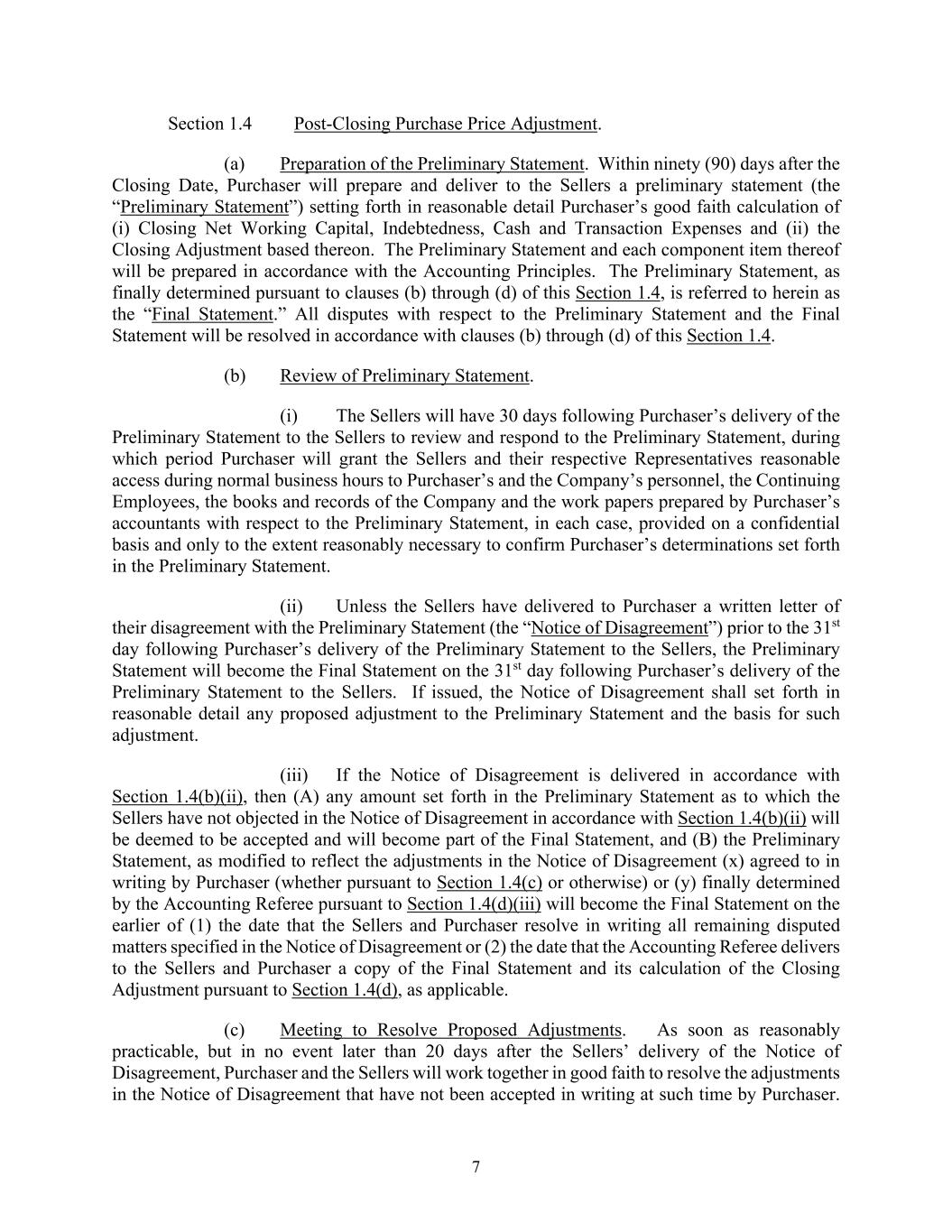 7 Section 1.4 Post-Closing Purchase Price Adjustment. (a) Preparation of the Preliminary Statement. Within ninety (90) days after the Closing Date, Purchaser will prepare and deliver to the Sellers a preliminary statement (the “Preliminary Statement”) setting forth in reasonable detail Purchaser’s good faith calculation of (i) Closing Net Working Capital, Indebtedness, Cash and Transaction Expenses and (ii) the Closing Adjustment based thereon. The Preliminary Statement and each component item thereof will be prepared in accordance with the Accounting Principles. The Preliminary Statement, as finally determined pursuant to clauses (b) through (d) of this Section 1.4, is referred to herein as the “Final Statement.” All disputes with respect to the Preliminary Statement and the Final Statement will be resolved in accordance with clauses (b) through (d) of this Section 1.4. (b) Review of Preliminary Statement. (i) The Sellers will have 30 days following Purchaser’s delivery of the Preliminary Statement to the Sellers to review and respond to the Preliminary Statement, during which period Purchaser will grant the Sellers and their respective Representatives reasonable access during normal business hours to Purchaser’s and the Company’s personnel, the Continuing Employees, the books and records of the Company and the work papers prepared by Purchaser’s accountants with respect to the Preliminary Statement, in each case, provided on a confidential basis and only to the extent reasonably necessary to confirm Purchaser’s determinations set forth in the Preliminary Statement. (ii) Unless the Sellers have delivered to Purchaser a written letter of their disagreement with the Preliminary Statement (the “Notice of Disagreement”) prior to the 31st day following Purchaser’s delivery of the Preliminary Statement to the Sellers, the Preliminary Statement will become the Final Statement on the 31st day following Purchaser’s delivery of the Preliminary Statement to the Sellers. If issued, the Notice of Disagreement shall set forth in reasonable detail any proposed adjustment to the Preliminary Statement and the basis for such adjustment. (iii) If the Notice of Disagreement is delivered in accordance with Section 1.4(b)(ii), then (A) any amount set forth in the Preliminary Statement as to which the Sellers have not objected in the Notice of Disagreement in accordance with Section 1.4(b)(ii) will be deemed to be accepted and will become part of the Final Statement, and (B) the Preliminary Statement, as modified to reflect the adjustments in the Notice of Disagreement (x) agreed to in writing by Purchaser (whether pursuant to Section 1.4(c) or otherwise) or (y) finally determined by the Accounting Referee pursuant to Section 1.4(d)(iii) will become the Final Statement on the earlier of (1) the date that the Sellers and Purchaser resolve in writing all remaining disputed matters specified in the Notice of Disagreement or (2) the date that the Accounting Referee delivers to the Sellers and Purchaser a copy of the Final Statement and its calculation of the Closing Adjustment pursuant to Section 1.4(d), as applicable. (c) Meeting to Resolve Proposed Adjustments. As soon as reasonably practicable, but in no event later than 20 days after the Sellers’ delivery of the Notice of Disagreement, Purchaser and the Sellers will work together in good faith to resolve the adjustments in the Notice of Disagreement that have not been accepted in writing at such time by Purchaser.