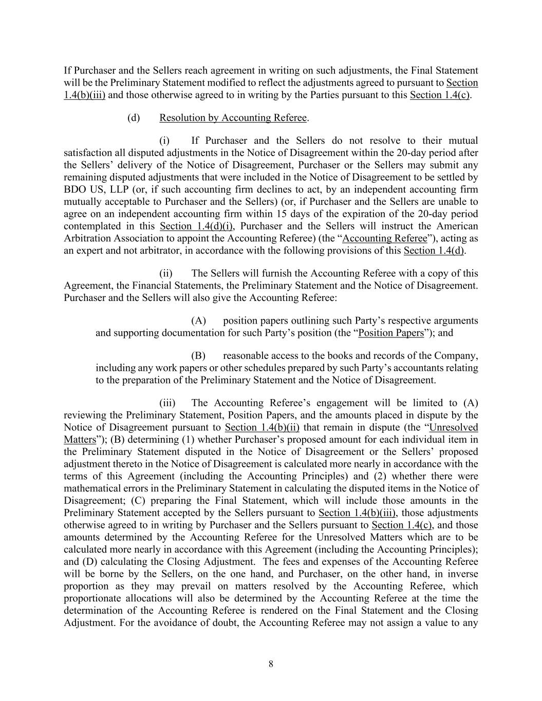 8 If Purchaser and the Sellers reach agreement in writing on such adjustments, the Final Statement will be the Preliminary Statement modified to reflect the adjustments agreed to pursuant to Section 1.4(b)(iii) and those otherwise agreed to in writing by the Parties pursuant to this Section 1.4(c). (d) Resolution by Accounting Referee. (i) If Purchaser and the Sellers do not resolve to their mutual satisfaction all disputed adjustments in the Notice of Disagreement within the 20-day period after the Sellers’ delivery of the Notice of Disagreement, Purchaser or the Sellers may submit any remaining disputed adjustments that were included in the Notice of Disagreement to be settled by BDO US, LLP (or, if such accounting firm declines to act, by an independent accounting firm mutually acceptable to Purchaser and the Sellers) (or, if Purchaser and the Sellers are unable to agree on an independent accounting firm within 15 days of the expiration of the 20-day period contemplated in this Section 1.4(d)(i), Purchaser and the Sellers will instruct the American Arbitration Association to appoint the Accounting Referee) (the “Accounting Referee”), acting as an expert and not arbitrator, in accordance with the following provisions of this Section 1.4(d). (ii) The Sellers will furnish the Accounting Referee with a copy of this Agreement, the Financial Statements, the Preliminary Statement and the Notice of Disagreement. Purchaser and the Sellers will also give the Accounting Referee: (A) position papers outlining such Party’s respective arguments and supporting documentation for such Party’s position (the “Position Papers”); and (B) reasonable access to the books and records of the Company, including any work papers or other schedules prepared by such Party’s accountants relating to the preparation of the Preliminary Statement and the Notice of Disagreement. (iii) The Accounting Referee’s engagement will be limited to (A) reviewing the Preliminary Statement, Position Papers, and the amounts placed in dispute by the Notice of Disagreement pursuant to Section 1.4(b)(ii) that remain in dispute (the “Unresolved Matters”); (B) determining (1) whether Purchaser’s proposed amount for each individual item in the Preliminary Statement disputed in the Notice of Disagreement or the Sellers’ proposed adjustment thereto in the Notice of Disagreement is calculated more nearly in accordance with the terms of this Agreement (including the Accounting Principles) and (2) whether there were mathematical errors in the Preliminary Statement in calculating the disputed items in the Notice of Disagreement; (C) preparing the Final Statement, which will include those amounts in the Preliminary Statement accepted by the Sellers pursuant to Section 1.4(b)(iii), those adjustments otherwise agreed to in writing by Purchaser and the Sellers pursuant to Section 1.4(c), and those amounts determined by the Accounting Referee for the Unresolved Matters which are to be calculated more nearly in accordance with this Agreement (including the Accounting Principles); and (D) calculating the Closing Adjustment. The fees and expenses of the Accounting Referee will be borne by the Sellers, on the one hand, and Purchaser, on the other hand, in inverse proportion as they may prevail on matters resolved by the Accounting Referee, which proportionate allocations will also be determined by the Accounting Referee at the time the determination of the Accounting Referee is rendered on the Final Statement and the Closing Adjustment. For the avoidance of doubt, the Accounting Referee may not assign a value to any