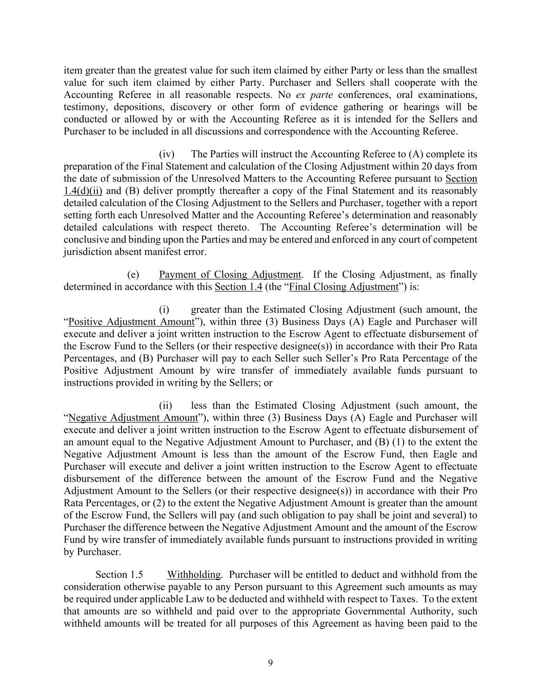 9 item greater than the greatest value for such item claimed by either Party or less than the smallest value for such item claimed by either Party. Purchaser and Sellers shall cooperate with the Accounting Referee in all reasonable respects. No ex parte conferences, oral examinations, testimony, depositions, discovery or other form of evidence gathering or hearings will be conducted or allowed by or with the Accounting Referee as it is intended for the Sellers and Purchaser to be included in all discussions and correspondence with the Accounting Referee. (iv) The Parties will instruct the Accounting Referee to (A) complete its preparation of the Final Statement and calculation of the Closing Adjustment within 20 days from the date of submission of the Unresolved Matters to the Accounting Referee pursuant to Section 1.4(d)(ii) and (B) deliver promptly thereafter a copy of the Final Statement and its reasonably detailed calculation of the Closing Adjustment to the Sellers and Purchaser, together with a report setting forth each Unresolved Matter and the Accounting Referee’s determination and reasonably detailed calculations with respect thereto. The Accounting Referee’s determination will be conclusive and binding upon the Parties and may be entered and enforced in any court of competent jurisdiction absent manifest error. (e) Payment of Closing Adjustment. If the Closing Adjustment, as finally determined in accordance with this Section 1.4 (the “Final Closing Adjustment”) is: (i) greater than the Estimated Closing Adjustment (such amount, the “Positive Adjustment Amount”), within three (3) Business Days (A) Eagle and Purchaser will execute and deliver a joint written instruction to the Escrow Agent to effectuate disbursement of the Escrow Fund to the Sellers (or their respective designee(s)) in accordance with their Pro Rata Percentages, and (B) Purchaser will pay to each Seller such Seller’s Pro Rata Percentage of the Positive Adjustment Amount by wire transfer of immediately available funds pursuant to instructions provided in writing by the Sellers; or (ii) less than the Estimated Closing Adjustment (such amount, the “Negative Adjustment Amount”), within three (3) Business Days (A) Eagle and Purchaser will execute and deliver a joint written instruction to the Escrow Agent to effectuate disbursement of an amount equal to the Negative Adjustment Amount to Purchaser, and (B) (1) to the extent the Negative Adjustment Amount is less than the amount of the Escrow Fund, then Eagle and Purchaser will execute and deliver a joint written instruction to the Escrow Agent to effectuate disbursement of the difference between the amount of the Escrow Fund and the Negative Adjustment Amount to the Sellers (or their respective designee(s)) in accordance with their Pro Rata Percentages, or (2) to the extent the Negative Adjustment Amount is greater than the amount of the Escrow Fund, the Sellers will pay (and such obligation to pay shall be joint and several) to Purchaser the difference between the Negative Adjustment Amount and the amount of the Escrow Fund by wire transfer of immediately available funds pursuant to instructions provided in writing by Purchaser. Section 1.5 Withholding. Purchaser will be entitled to deduct and withhold from the consideration otherwise payable to any Person pursuant to this Agreement such amounts as may be required under applicable Law to be deducted and withheld with respect to Taxes. To the extent that amounts are so withheld and paid over to the appropriate Governmental Authority, such withheld amounts will be treated for all purposes of this Agreement as having been paid to the