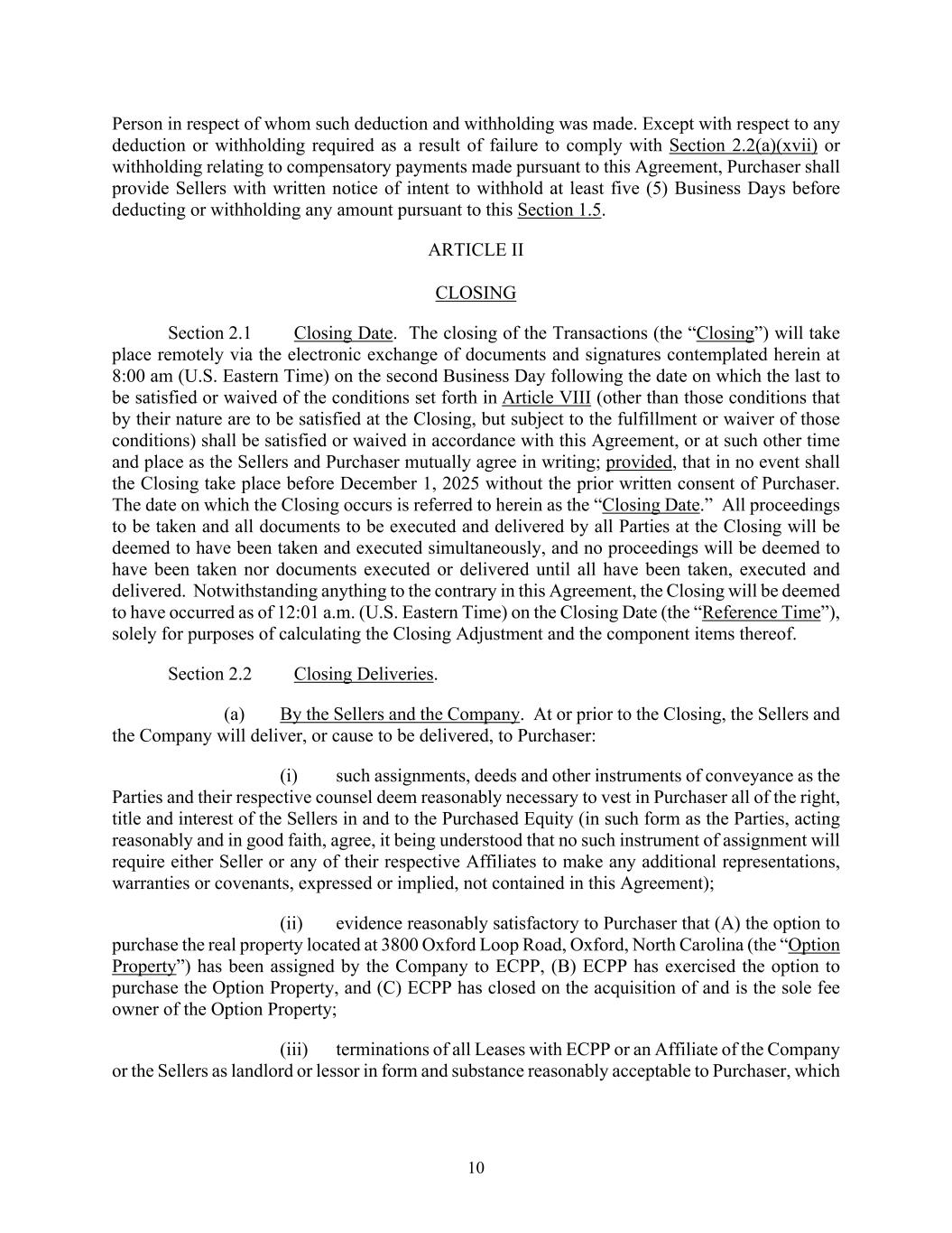 10 Person in respect of whom such deduction and withholding was made. Except with respect to any deduction or withholding required as a result of failure to comply with Section 2.2(a)(xvii) or withholding relating to compensatory payments made pursuant to this Agreement, Purchaser shall provide Sellers with written notice of intent to withhold at least five (5) Business Days before deducting or withholding any amount pursuant to this Section 1.5. ARTICLE II CLOSING Section 2.1 Closing Date. The closing of the Transactions (the “Closing”) will take place remotely via the electronic exchange of documents and signatures contemplated herein at 8:00 am (U.S. Eastern Time) on the second Business Day following the date on which the last to be satisfied or waived of the conditions set forth in Article VIII (other than those conditions that by their nature are to be satisfied at the Closing, but subject to the fulfillment or waiver of those conditions) shall be satisfied or waived in accordance with this Agreement, or at such other time and place as the Sellers and Purchaser mutually agree in writing; provided, that in no event shall the Closing take place before December 1, 2025 without the prior written consent of Purchaser. The date on which the Closing occurs is referred to herein as the “Closing Date.” All proceedings to be taken and all documents to be executed and delivered by all Parties at the Closing will be deemed to have been taken and executed simultaneously, and no proceedings will be deemed to have been taken nor documents executed or delivered until all have been taken, executed and delivered. Notwithstanding anything to the contrary in this Agreement, the Closing will be deemed to have occurred as of 12:01 a.m. (U.S. Eastern Time) on the Closing Date (the “Reference Time”), solely for purposes of calculating the Closing Adjustment and the component items thereof. Section 2.2 Closing Deliveries. (a) By the Sellers and the Company. At or prior to the Closing, the Sellers and the Company will deliver, or cause to be delivered, to Purchaser: (i) such assignments, deeds and other instruments of conveyance as the Parties and their respective counsel deem reasonably necessary to vest in Purchaser all of the right, title and interest of the Sellers in and to the Purchased Equity (in such form as the Parties, acting reasonably and in good faith, agree, it being understood that no such instrument of assignment will require either Seller or any of their respective Affiliates to make any additional representations, warranties or covenants, expressed or implied, not contained in this Agreement); (ii) evidence reasonably satisfactory to Purchaser that (A) the option to purchase the real property located at 3800 Oxford Loop Road, Oxford, North Carolina (the “Option Property”) has been assigned by the Company to ECPP, (B) ECPP has exercised the option to purchase the Option Property, and (C) ECPP has closed on the acquisition of and is the sole fee owner of the Option Property; (iii) terminations of all Leases with ECPP or an Affiliate of the Company or the Sellers as landlord or lessor in form and substance reasonably acceptable to Purchaser, which