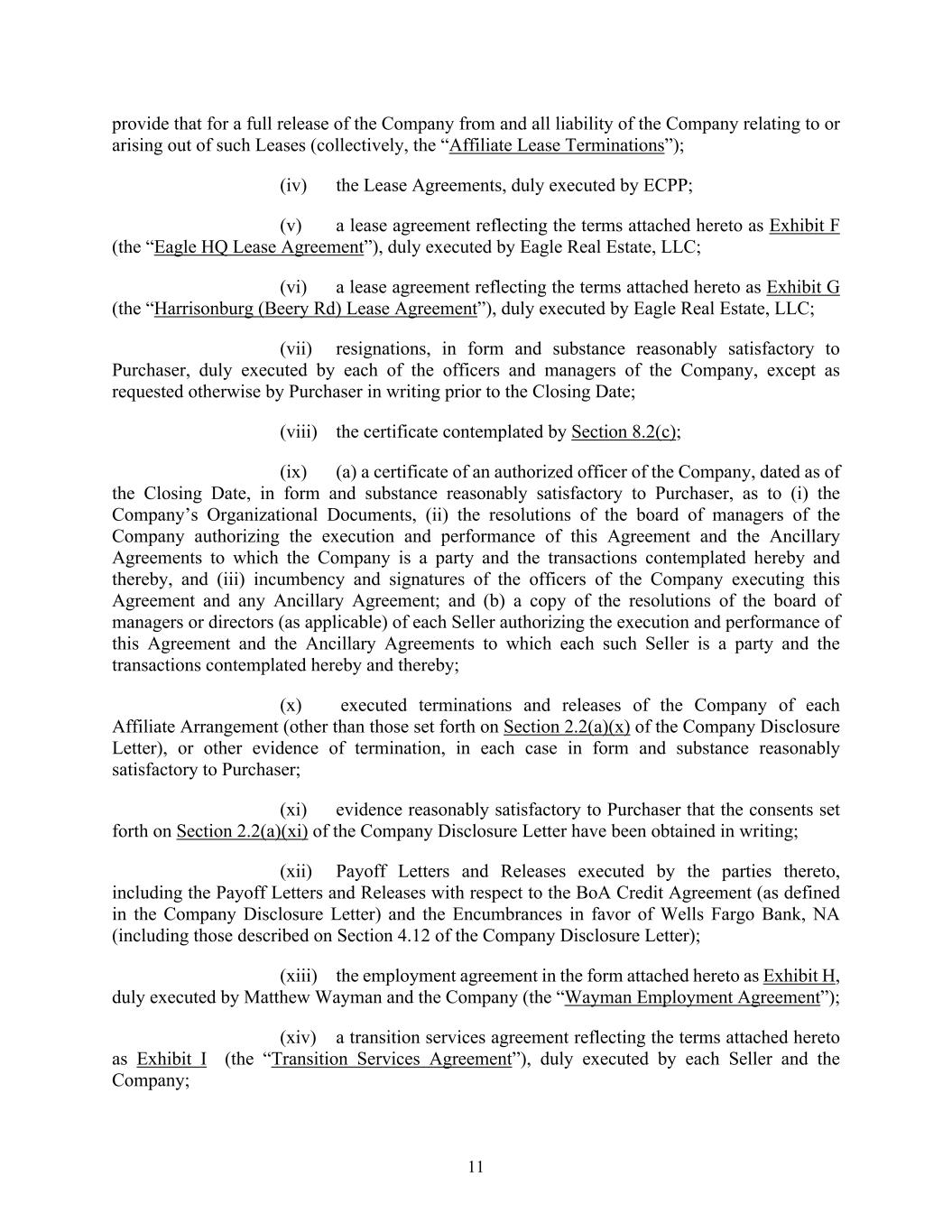 11 provide that for a full release of the Company from and all liability of the Company relating to or arising out of such Leases (collectively, the “Affiliate Lease Terminations”); (iv) the Lease Agreements, duly executed by ECPP; (v) a lease agreement reflecting the terms attached hereto as Exhibit F (the “Eagle HQ Lease Agreement”), duly executed by Eagle Real Estate, LLC; (vi) a lease agreement reflecting the terms attached hereto as Exhibit G (the “Harrisonburg (Beery Rd) Lease Agreement”), duly executed by Eagle Real Estate, LLC; (vii) resignations, in form and substance reasonably satisfactory to Purchaser, duly executed by each of the officers and managers of the Company, except as requested otherwise by Purchaser in writing prior to the Closing Date; (viii) the certificate contemplated by Section 8.2(c); (ix) (a) a certificate of an authorized officer of the Company, dated as of the Closing Date, in form and substance reasonably satisfactory to Purchaser, as to (i) the Company’s Organizational Documents, (ii) the resolutions of the board of managers of the Company authorizing the execution and performance of this Agreement and the Ancillary Agreements to which the Company is a party and the transactions contemplated hereby and thereby, and (iii) incumbency and signatures of the officers of the Company executing this Agreement and any Ancillary Agreement; and (b) a copy of the resolutions of the board of managers or directors (as applicable) of each Seller authorizing the execution and performance of this Agreement and the Ancillary Agreements to which each such Seller is a party and the transactions contemplated hereby and thereby; (x) executed terminations and releases of the Company of each Affiliate Arrangement (other than those set forth on Section 2.2(a)(x) of the Company Disclosure Letter), or other evidence of termination, in each case in form and substance reasonably satisfactory to Purchaser; (xi) evidence reasonably satisfactory to Purchaser that the consents set forth on Section 2.2(a)(xi) of the Company Disclosure Letter have been obtained in writing; (xii) Payoff Letters and Releases executed by the parties thereto, including the Payoff Letters and Releases with respect to the BoA Credit Agreement (as defined in the Company Disclosure Letter) and the Encumbrances in favor of Wells Fargo Bank, NA (including those described on Section 4.12 of the Company Disclosure Letter); (xiii) the employment agreement in the form attached hereto as Exhibit H, duly executed by Matthew Wayman and the Company (the “Wayman Employment Agreement”); (xiv) a transition services agreement reflecting the terms attached hereto as Exhibit I (the “Transition Services Agreement”), duly executed by each Seller and the Company;