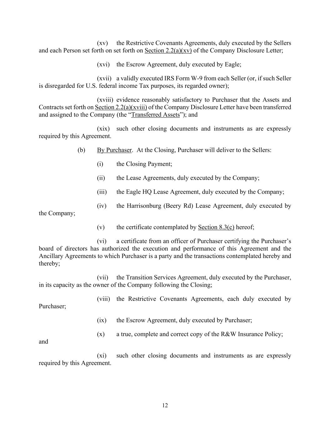 12 (xv) the Restrictive Covenants Agreements, duly executed by the Sellers and each Person set forth on set forth on Section 2.2(a)(xv) of the Company Disclosure Letter; (xvi) the Escrow Agreement, duly executed by Eagle; (xvii) a validly executed IRS Form W-9 from each Seller (or, if such Seller is disregarded for U.S. federal income Tax purposes, its regarded owner); (xviii) evidence reasonably satisfactory to Purchaser that the Assets and Contracts set forth on Section 2.2(a)(xviii) of the Company Disclosure Letter have been transferred and assigned to the Company (the “Transferred Assets”); and (xix) such other closing documents and instruments as are expressly required by this Agreement. (b) By Purchaser. At the Closing, Purchaser will deliver to the Sellers: (i) the Closing Payment; (ii) the Lease Agreements, duly executed by the Company; (iii) the Eagle HQ Lease Agreement, duly executed by the Company; (iv) the Harrisonburg (Beery Rd) Lease Agreement, duly executed by the Company; (v) the certificate contemplated by Section 8.3(c) hereof; (vi) a certificate from an officer of Purchaser certifying the Purchaser’s board of directors has authorized the execution and performance of this Agreement and the Ancillary Agreements to which Purchaser is a party and the transactions contemplated hereby and thereby; (vii) the Transition Services Agreement, duly executed by the Purchaser, in its capacity as the owner of the Company following the Closing; (viii) the Restrictive Covenants Agreements, each duly executed by Purchaser; (ix) the Escrow Agreement, duly executed by Purchaser; (x) a true, complete and correct copy of the R&W Insurance Policy; and (xi) such other closing documents and instruments as are expressly required by this Agreement.