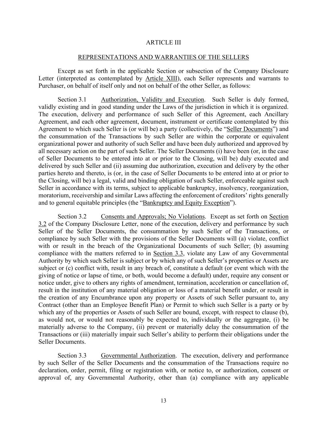 13 ARTICLE III REPRESENTATIONS AND WARRANTIES OF THE SELLERS Except as set forth in the applicable Section or subsection of the Company Disclosure Letter (interpreted as contemplated by Article XIII), each Seller represents and warrants to Purchaser, on behalf of itself only and not on behalf of the other Seller, as follows: Section 3.1 Authorization, Validity and Execution. Such Seller is duly formed, validly existing and in good standing under the Laws of the jurisdiction in which it is organized. The execution, delivery and performance of such Seller of this Agreement, each Ancillary Agreement, and each other agreement, document, instrument or certificate contemplated by this Agreement to which such Seller is (or will be) a party (collectively, the “Seller Documents”) and the consummation of the Transactions by such Seller are within the corporate or equivalent organizational power and authority of such Seller and have been duly authorized and approved by all necessary action on the part of such Seller. The Seller Documents (i) have been (or, in the case of Seller Documents to be entered into at or prior to the Closing, will be) duly executed and delivered by such Seller and (ii) assuming due authorization, execution and delivery by the other parties hereto and thereto, is (or, in the case of Seller Documents to be entered into at or prior to the Closing, will be) a legal, valid and binding obligation of such Seller, enforceable against such Seller in accordance with its terms, subject to applicable bankruptcy, insolvency, reorganization, moratorium, receivership and similar Laws affecting the enforcement of creditors’ rights generally and to general equitable principles (the “Bankruptcy and Equity Exception”). Section 3.2 Consents and Approvals; No Violations. Except as set forth on Section 3.2 of the Company Disclosure Letter, none of the execution, delivery and performance by such Seller of the Seller Documents, the consummation by such Seller of the Transactions, or compliance by such Seller with the provisions of the Seller Documents will (a) violate, conflict with or result in the breach of the Organizational Documents of such Seller; (b) assuming compliance with the matters referred to in Section 3.3, violate any Law of any Governmental Authority by which such Seller is subject or by which any of such Seller’s properties or Assets are subject or (c) conflict with, result in any breach of, constitute a default (or event which with the giving of notice or lapse of time, or both, would become a default) under, require any consent or notice under, give to others any rights of amendment, termination, acceleration or cancellation of, result in the institution of any material obligation or loss of a material benefit under, or result in the creation of any Encumbrance upon any property or Assets of such Seller pursuant to, any Contract (other than an Employee Benefit Plan) or Permit to which such Seller is a party or by which any of the properties or Assets of such Seller are bound, except, with respect to clause (b), as would not, or would not reasonably be expected to, individually or the aggregate, (i) be materially adverse to the Company, (ii) prevent or materially delay the consummation of the Transactions or (iii) materially impair such Seller’s ability to perform their obligations under the Seller Documents. Section 3.3 Governmental Authorization. The execution, delivery and performance by such Seller of the Seller Documents and the consummation of the Transactions require no declaration, order, permit, filing or registration with, or notice to, or authorization, consent or approval of, any Governmental Authority, other than (a) compliance with any applicable