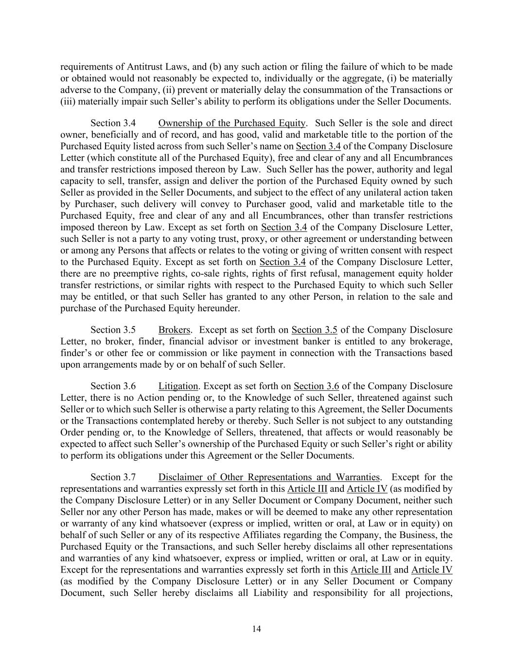 14 requirements of Antitrust Laws, and (b) any such action or filing the failure of which to be made or obtained would not reasonably be expected to, individually or the aggregate, (i) be materially adverse to the Company, (ii) prevent or materially delay the consummation of the Transactions or (iii) materially impair such Seller’s ability to perform its obligations under the Seller Documents. Section 3.4 Ownership of the Purchased Equity. Such Seller is the sole and direct owner, beneficially and of record, and has good, valid and marketable title to the portion of the Purchased Equity listed across from such Seller’s name on Section 3.4 of the Company Disclosure Letter (which constitute all of the Purchased Equity), free and clear of any and all Encumbrances and transfer restrictions imposed thereon by Law. Such Seller has the power, authority and legal capacity to sell, transfer, assign and deliver the portion of the Purchased Equity owned by such Seller as provided in the Seller Documents, and subject to the effect of any unilateral action taken by Purchaser, such delivery will convey to Purchaser good, valid and marketable title to the Purchased Equity, free and clear of any and all Encumbrances, other than transfer restrictions imposed thereon by Law. Except as set forth on Section 3.4 of the Company Disclosure Letter, such Seller is not a party to any voting trust, proxy, or other agreement or understanding between or among any Persons that affects or relates to the voting or giving of written consent with respect to the Purchased Equity. Except as set forth on Section 3.4 of the Company Disclosure Letter, there are no preemptive rights, co-sale rights, rights of first refusal, management equity holder transfer restrictions, or similar rights with respect to the Purchased Equity to which such Seller may be entitled, or that such Seller has granted to any other Person, in relation to the sale and purchase of the Purchased Equity hereunder. Section 3.5 Brokers. Except as set forth on Section 3.5 of the Company Disclosure Letter, no broker, finder, financial advisor or investment banker is entitled to any brokerage, finder’s or other fee or commission or like payment in connection with the Transactions based upon arrangements made by or on behalf of such Seller. Section 3.6 Litigation. Except as set forth on Section 3.6 of the Company Disclosure Letter, there is no Action pending or, to the Knowledge of such Seller, threatened against such Seller or to which such Seller is otherwise a party relating to this Agreement, the Seller Documents or the Transactions contemplated hereby or thereby. Such Seller is not subject to any outstanding Order pending or, to the Knowledge of Sellers, threatened, that affects or would reasonably be expected to affect such Seller’s ownership of the Purchased Equity or such Seller’s right or ability to perform its obligations under this Agreement or the Seller Documents. Section 3.7 Disclaimer of Other Representations and Warranties. Except for the representations and warranties expressly set forth in this Article III and Article IV (as modified by the Company Disclosure Letter) or in any Seller Document or Company Document, neither such Seller nor any other Person has made, makes or will be deemed to make any other representation or warranty of any kind whatsoever (express or implied, written or oral, at Law or in equity) on behalf of such Seller or any of its respective Affiliates regarding the Company, the Business, the Purchased Equity or the Transactions, and such Seller hereby disclaims all other representations and warranties of any kind whatsoever, express or implied, written or oral, at Law or in equity. Except for the representations and warranties expressly set forth in this Article III and Article IV (as modified by the Company Disclosure Letter) or in any Seller Document or Company Document, such Seller hereby disclaims all Liability and responsibility for all projections,