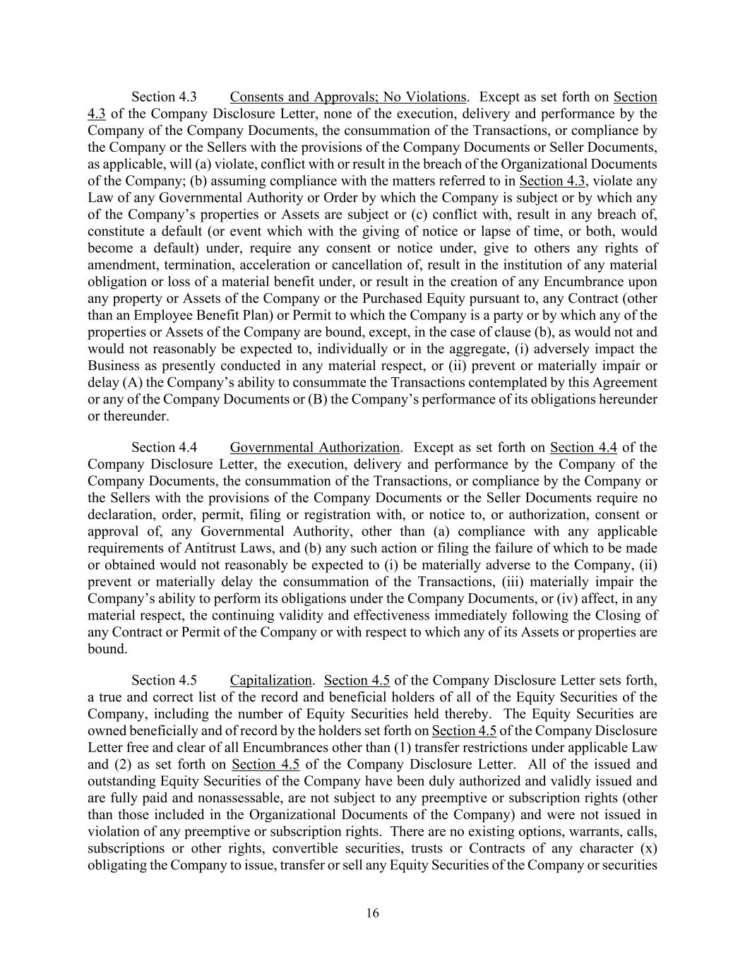 16 Section 4.3 Consents and Approvals; No Violations. Except as set forth on Section 4.3 of the Company Disclosure Letter, none of the execution, delivery and performance by the Company of the Company Documents, the consummation of the Transactions, or compliance by the Company or the Sellers with the provisions of the Company Documents or Seller Documents, as applicable, will (a) violate, conflict with or result in the breach of the Organizational Documents of the Company; (b) assuming compliance with the matters referred to in Section 4.3, violate any Law of any Governmental Authority or Order by which the Company is subject or by which any of the Company’s properties or Assets are subject or (c) conflict with, result in any breach of, constitute a default (or event which with the giving of notice or lapse of time, or both, would become a default) under, require any consent or notice under, give to others any rights of amendment, termination, acceleration or cancellation of, result in the institution of any material obligation or loss of a material benefit under, or result in the creation of any Encumbrance upon any property or Assets of the Company or the Purchased Equity pursuant to, any Contract (other than an Employee Benefit Plan) or Permit to which the Company is a party or by which any of the properties or Assets of the Company are bound, except, in the case of clause (b), as would not and would not reasonably be expected to, individually or in the aggregate, (i) adversely impact the Business as presently conducted in any material respect, or (ii) prevent or materially impair or delay (A) the Company’s ability to consummate the Transactions contemplated by this Agreement or any of the Company Documents or (B) the Company’s performance of its obligations hereunder or thereunder. Section 4.4 Governmental Authorization. Except as set forth on Section 4.4 of the Company Disclosure Letter, the execution, delivery and performance by the Company of the Company Documents, the consummation of the Transactions, or compliance by the Company or the Sellers with the provisions of the Company Documents or the Seller Documents require no declaration, order, permit, filing or registration with, or notice to, or authorization, consent or approval of, any Governmental Authority, other than (a) compliance with any applicable requirements of Antitrust Laws, and (b) any such action or filing the failure of which to be made or obtained would not reasonably be expected to (i) be materially adverse to the Company, (ii) prevent or materially delay the consummation of the Transactions, (iii) materially impair the Company’s ability to perform its obligations under the Company Documents, or (iv) affect, in any material respect, the continuing validity and effectiveness immediately following the Closing of any Contract or Permit of the Company or with respect to which any of its Assets or properties are bound. Section 4.5 Capitalization. Section 4.5 of the Company Disclosure Letter sets forth, a true and correct list of the record and beneficial holders of all of the Equity Securities of the Company, including the number of Equity Securities held thereby. The Equity Securities are owned beneficially and of record by the holders set forth on Section 4.5 of the Company Disclosure Letter free and clear of all Encumbrances other than (1) transfer restrictions under applicable Law and (2) as set forth on Section 4.5 of the Company Disclosure Letter. All of the issued and outstanding Equity Securities of the Company have been duly authorized and validly issued and are fully paid and nonassessable, are not subject to any preemptive or subscription rights (other than those included in the Organizational Documents of the Company) and were not issued in violation of any preemptive or subscription rights. There are no existing options, warrants, calls, subscriptions or other rights, convertible securities, trusts or Contracts of any character (x) obligating the Company to issue, transfer or sell any Equity Securities of the Company or securities