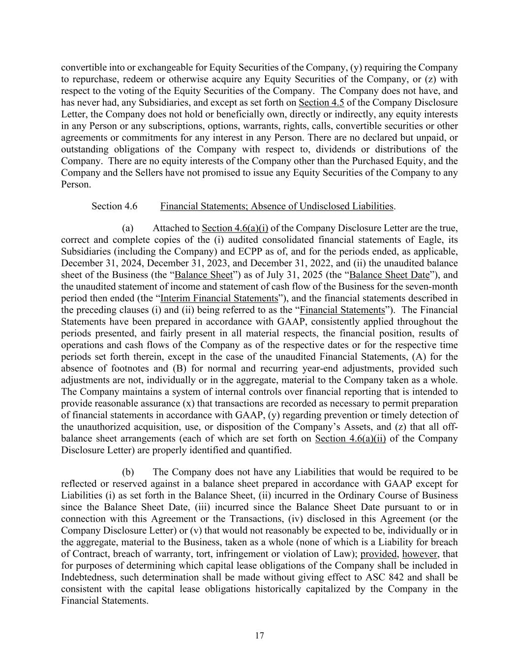 17 convertible into or exchangeable for Equity Securities of the Company, (y) requiring the Company to repurchase, redeem or otherwise acquire any Equity Securities of the Company, or (z) with respect to the voting of the Equity Securities of the Company. The Company does not have, and has never had, any Subsidiaries, and except as set forth on Section 4.5 of the Company Disclosure Letter, the Company does not hold or beneficially own, directly or indirectly, any equity interests in any Person or any subscriptions, options, warrants, rights, calls, convertible securities or other agreements or commitments for any interest in any Person. There are no declared but unpaid, or outstanding obligations of the Company with respect to, dividends or distributions of the Company. There are no equity interests of the Company other than the Purchased Equity, and the Company and the Sellers have not promised to issue any Equity Securities of the Company to any Person. Section 4.6 Financial Statements; Absence of Undisclosed Liabilities. (a) Attached to Section 4.6(a)(i) of the Company Disclosure Letter are the true, correct and complete copies of the (i) audited consolidated financial statements of Eagle, its Subsidiaries (including the Company) and ECPP as of, and for the periods ended, as applicable, December 31, 2024, December 31, 2023, and December 31, 2022, and (ii) the unaudited balance sheet of the Business (the “Balance Sheet”) as of July 31, 2025 (the “Balance Sheet Date”), and the unaudited statement of income and statement of cash flow of the Business for the seven-month period then ended (the “Interim Financial Statements”), and the financial statements described in the preceding clauses (i) and (ii) being referred to as the “Financial Statements”). The Financial Statements have been prepared in accordance with GAAP, consistently applied throughout the periods presented, and fairly present in all material respects, the financial position, results of operations and cash flows of the Company as of the respective dates or for the respective time periods set forth therein, except in the case of the unaudited Financial Statements, (A) for the absence of footnotes and (B) for normal and recurring year-end adjustments, provided such adjustments are not, individually or in the aggregate, material to the Company taken as a whole. The Company maintains a system of internal controls over financial reporting that is intended to provide reasonable assurance (x) that transactions are recorded as necessary to permit preparation of financial statements in accordance with GAAP, (y) regarding prevention or timely detection of the unauthorized acquisition, use, or disposition of the Company’s Assets, and (z) that all off- balance sheet arrangements (each of which are set forth on Section 4.6(a)(ii) of the Company Disclosure Letter) are properly identified and quantified. (b) The Company does not have any Liabilities that would be required to be reflected or reserved against in a balance sheet prepared in accordance with GAAP except for Liabilities (i) as set forth in the Balance Sheet, (ii) incurred in the Ordinary Course of Business since the Balance Sheet Date, (iii) incurred since the Balance Sheet Date pursuant to or in connection with this Agreement or the Transactions, (iv) disclosed in this Agreement (or the Company Disclosure Letter) or (v) that would not reasonably be expected to be, individually or in the aggregate, material to the Business, taken as a whole (none of which is a Liability for breach of Contract, breach of warranty, tort, infringement or violation of Law); provided, however, that for purposes of determining which capital lease obligations of the Company shall be included in Indebtedness, such determination shall be made without giving effect to ASC 842 and shall be consistent with the capital lease obligations historically capitalized by the Company in the Financial Statements.