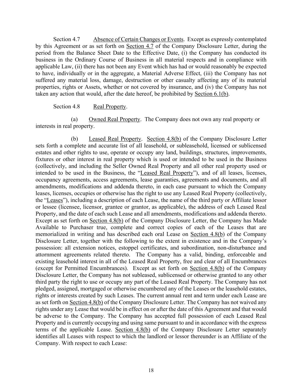 18 Section 4.7 Absence of Certain Changes or Events. Except as expressly contemplated by this Agreement or as set forth on Section 4.7 of the Company Disclosure Letter, during the period from the Balance Sheet Date to the Effective Date, (i) the Company has conducted its business in the Ordinary Course of Business in all material respects and in compliance with applicable Law, (ii) there has not been any Event which has had or would reasonably be expected to have, individually or in the aggregate, a Material Adverse Effect, (iii) the Company has not suffered any material loss, damage, destruction or other casualty affecting any of its material properties, rights or Assets, whether or not covered by insurance, and (iv) the Company has not taken any action that would, after the date hereof, be prohibited by Section 6.1(b). Section 4.8 Real Property. (a) Owned Real Property. The Company does not own any real property or interests in real property. (b) Leased Real Property. Section 4.8(b) of the Company Disclosure Letter sets forth a complete and accurate list of all leasehold, or subleasehold, licensed or sublicensed estates and other rights to use, operate or occupy any land, buildings, structures, improvements, fixtures or other interest in real property which is used or intended to be used in the Business (collectively, and including the Seller Owned Real Property and all other real property used or intended to be used in the Business, the “Leased Real Property”), and of all leases, licenses, occupancy agreements, access agreements, lease guaranties, agreements and documents, and all amendments, modifications and addenda thereto, in each case pursuant to which the Company leases, licenses, occupies or otherwise has the right to use any Leased Real Property (collectively, the “Leases”), including a description of each Lease, the name of the third party or Affiliate lessor or lessee (licensee, licensor, grantee or grantor, as applicable), the address of each Leased Real Property, and the date of each such Lease and all amendments, modifications and addenda thereto. Except as set forth on Section 4.8(b) of the Company Disclosure Letter, the Company has Made Available to Purchaser true, complete and correct copies of each of the Leases that are memorialized in writing and has described each oral Lease on Section 4.8(b) of the Company Disclosure Letter, together with the following to the extent in existence and in the Company’s possession: all extension notices, estoppel certificates, and subordination, non-disturbance and attornment agreements related thereto. The Company has a valid, binding, enforceable and existing leasehold interest in all of the Leased Real Property, free and clear of all Encumbrances (except for Permitted Encumbrances). Except as set forth on Section 4.8(b) of the Company Disclosure Letter, the Company has not subleased, sublicensed or otherwise granted to any other third party the right to use or occupy any part of the Leased Real Property. The Company has not pledged, assigned, mortgaged or otherwise encumbered any of the Leases or the leasehold estates, rights or interests created by such Leases. The current annual rent and term under each Lease are as set forth on Section 4.8(b) of the Company Disclosure Letter. The Company has not waived any rights under any Lease that would be in effect on or after the date of this Agreement and that would be adverse to the Company. The Company has accepted full possession of each Leased Real Property and is currently occupying and using same pursuant to and in accordance with the express terms of the applicable Lease. Section 4.8(b) of the Company Disclosure Letter separately identifies all Leases with respect to which the landlord or lessor thereunder is an Affiliate of the Company. With respect to each Lease:
